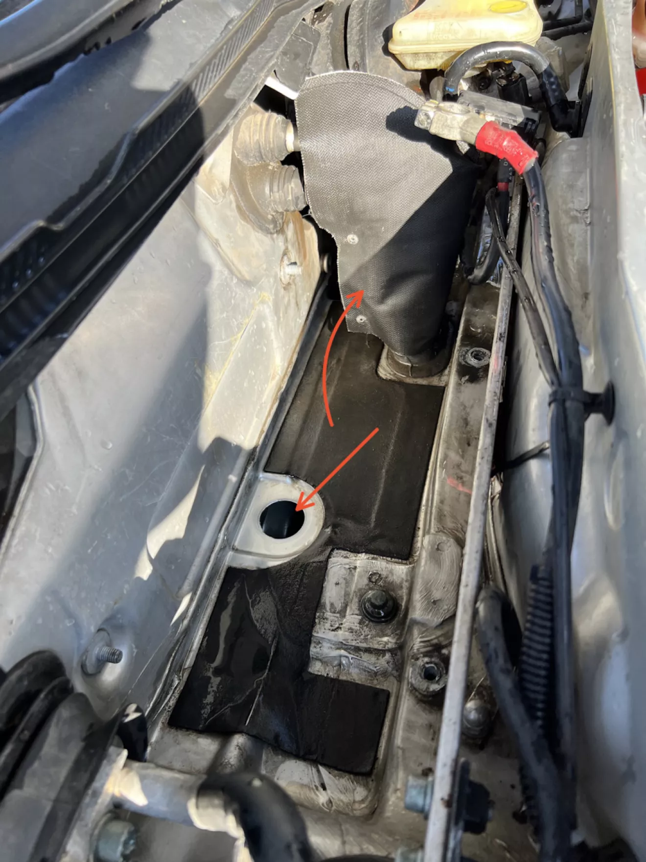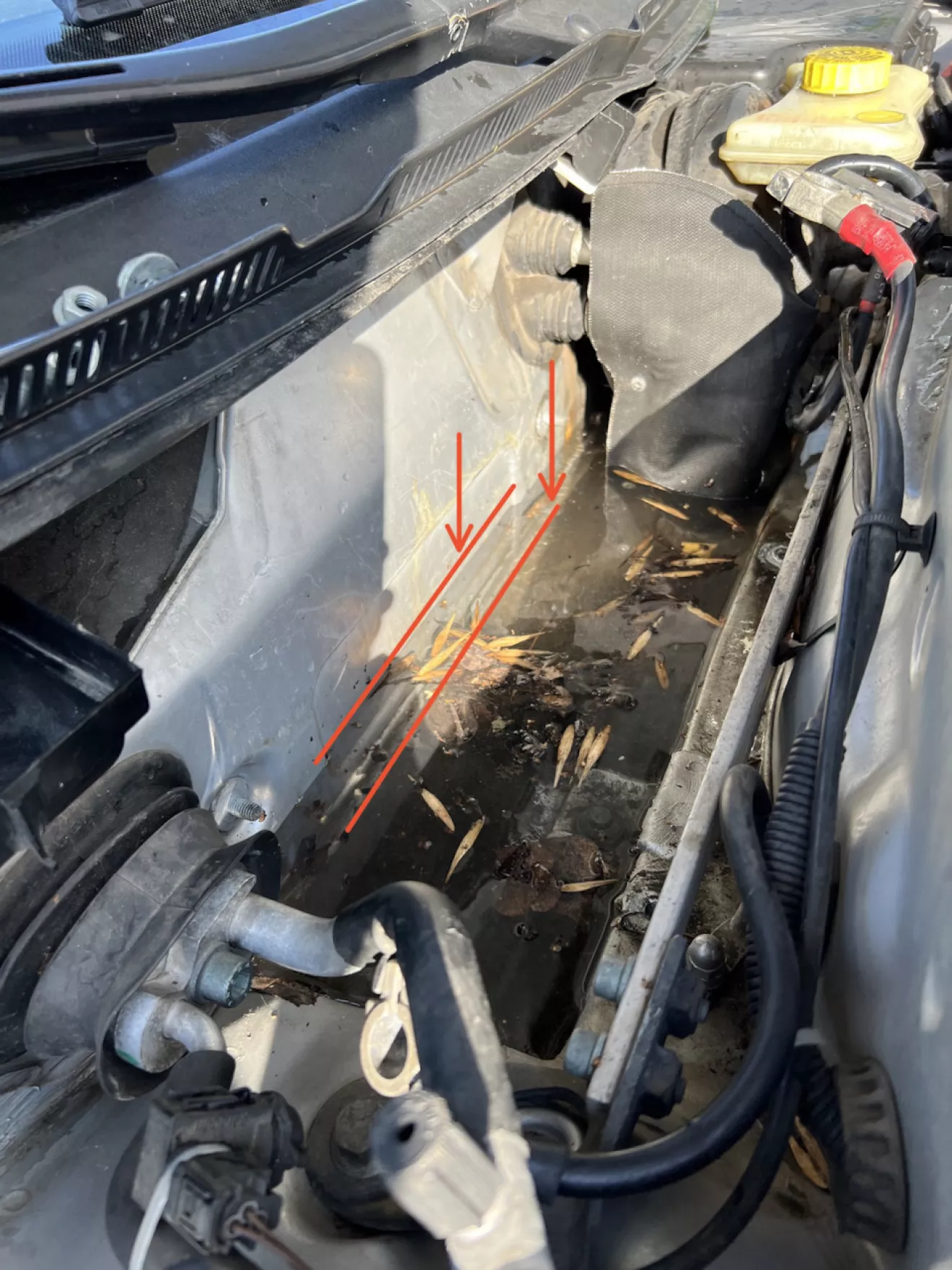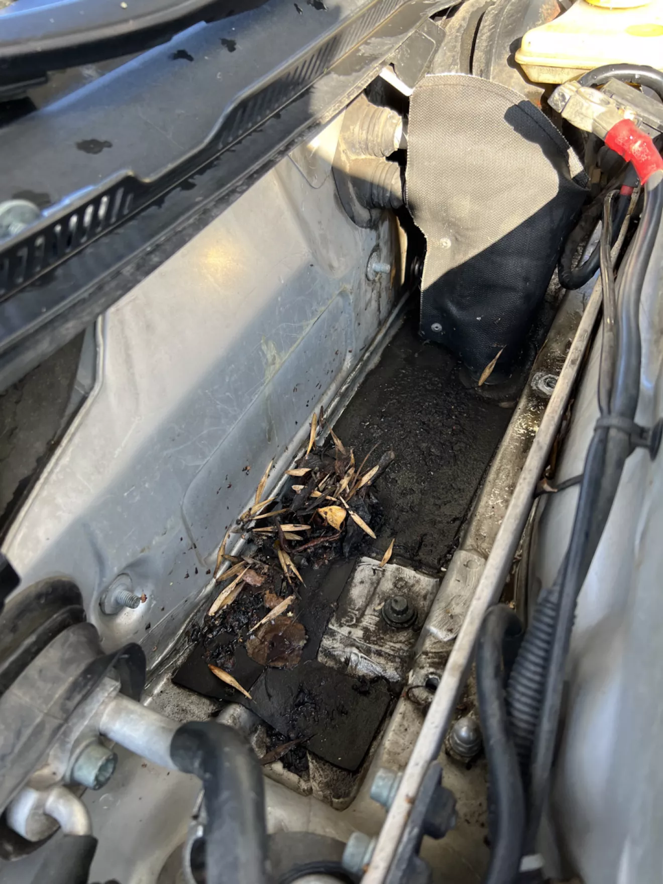 Ещё с прошлого года меня почему-то беспокоила мысль о забитых дренажных отверстиях и чуйка не подвела. В основном переживал потому, что 1 раз туда полез и теперь знаю, как быстро они забиваются 😐 Авто всегда стоит под деревьями. Каштан, липа, клён … Всё это падает и забивает сливы от краёв возле петлей капота до низа под площадку для АКБ.