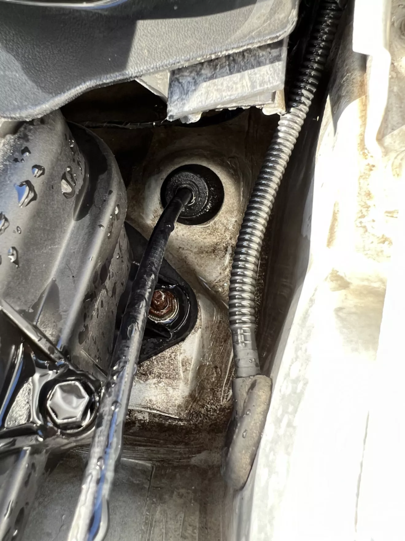 Снял АКБ, трещёткой с головой на 13 выкрутил болты и гайки крепления площадки и убрал её. Открылся отличный вид как все эти листья и вертолётики забили дренажи. Кинул шланг и вода начала подниматься еле просачиваясь в дренаж …