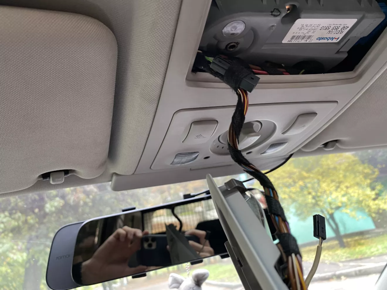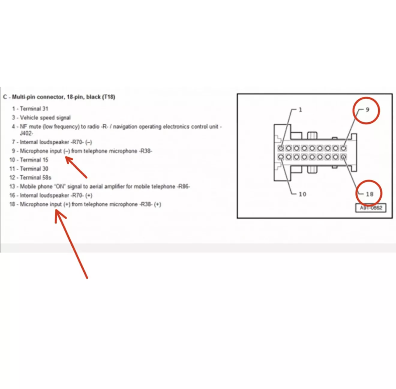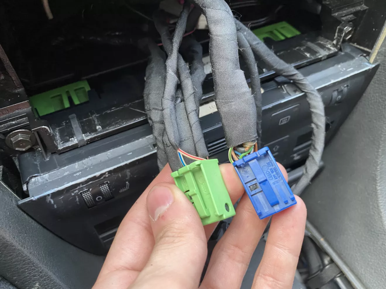 Я задрот ещё тот … Мало того, что имею диск с русифицированной прошивкой и всё равно прошил на официальную 0650 и использую немецкий язык как на приборке, так ещё полез в плафон к микрофону, чтобы посмотреть какой пин на микрофон в экране 😂 По моему минусовой в экране 😁 Взял новую проводку и подсоединил концы проводки к вытащенным пинам. Всё хорошо заизолировал и конечно же замотал в мягкую изоленту. Далее проложил провод с штатным вдоль консоли и вывел второй отрезок к разъёмам магнитолы. Подключаться надо к разъёму " С " это зелёный.
