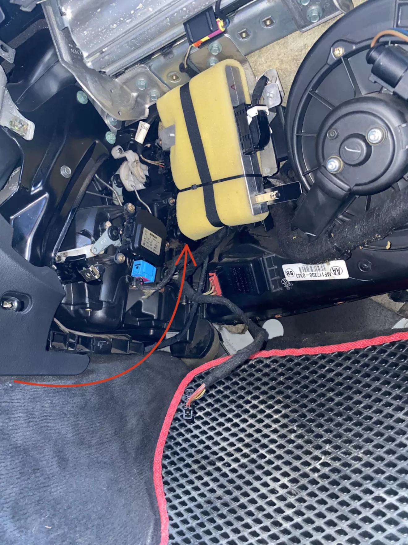 Блок блютуз закрепил за бардачком. За ним стоит кронштейн. По номеру запчасти узнал, что к нему прикручиваются 2 маленьких блока. Это блоки управления на свет. У меня авто корректор и блоков там нет, только датчики положения кузова на рычагах. Потом дошло понимание и вспомнил, что есть комплектации С5 для северной Америки. Там все обязаны ездить с включенным ближним светом. Видимо эти блоки света и ставятся туда. Также мне знакомый ещё давно рассказывал, что кто то из его знакомых купил С5 и на ней сразу при включении зажигания включался ближний учитывая то, что крутилка света была на нуле. Итак, проложил проводку к блоку под консолью и вывел к проводке моторчика печки. Поднял проводку вверх и завёл за этот кронштейн. Подключил разъём. Всё чётко отмерил, даже немного лишнего осталось 🙂 До подключения обернул блок в поролон, соединил вместе 2 хомута и завёл за кронштейн. Приставил блок, поднял до упора в самый верх и прижал хомутом. Поднял вверх, чтобы антенна блютуз не упиралась в моторчик печки. Другой стороной поставить блок не получится, будет упираться антенной.