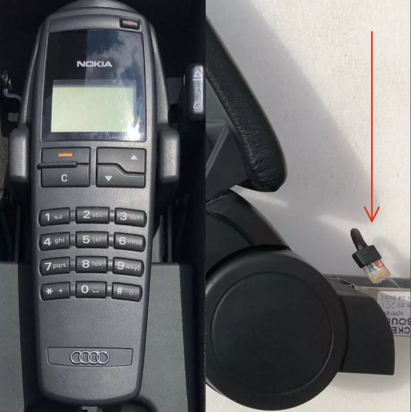 В подлокотнике стоял только голый металлический каркас с кнопкой и при её нажатии, весь механизм резко выскакивал вверх и вперёд. На дне подлокотника отверстие для выхода провода, а под подлокотником разъём от телефона к блоку.
