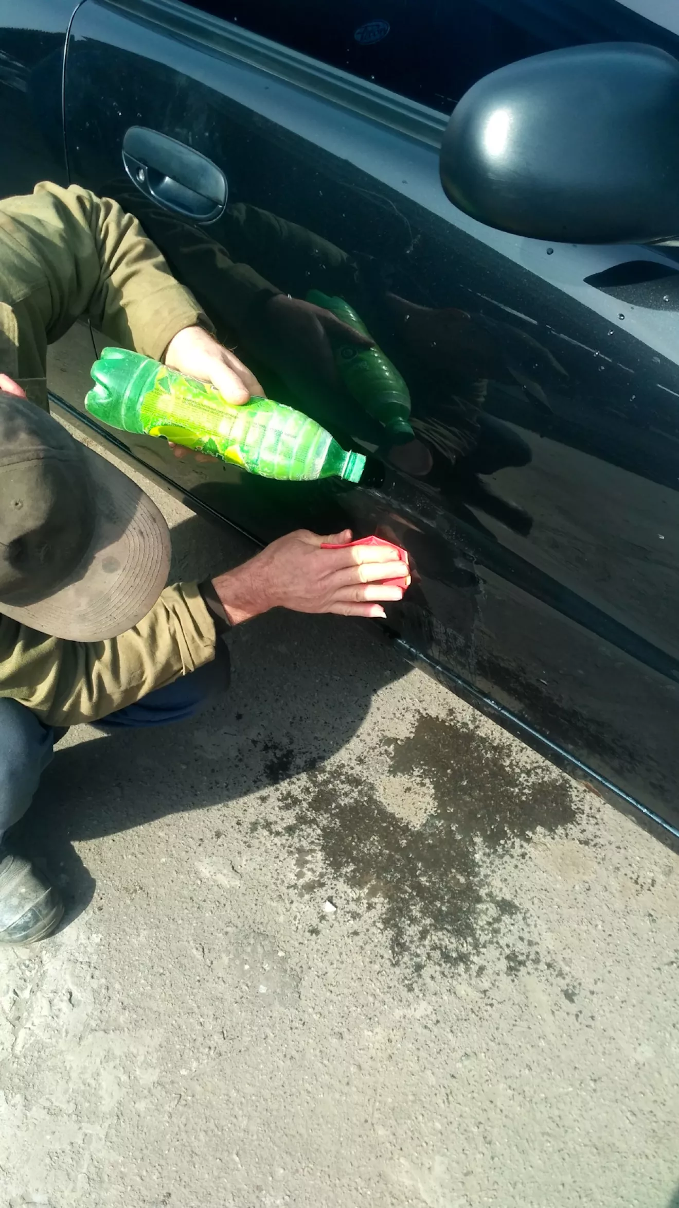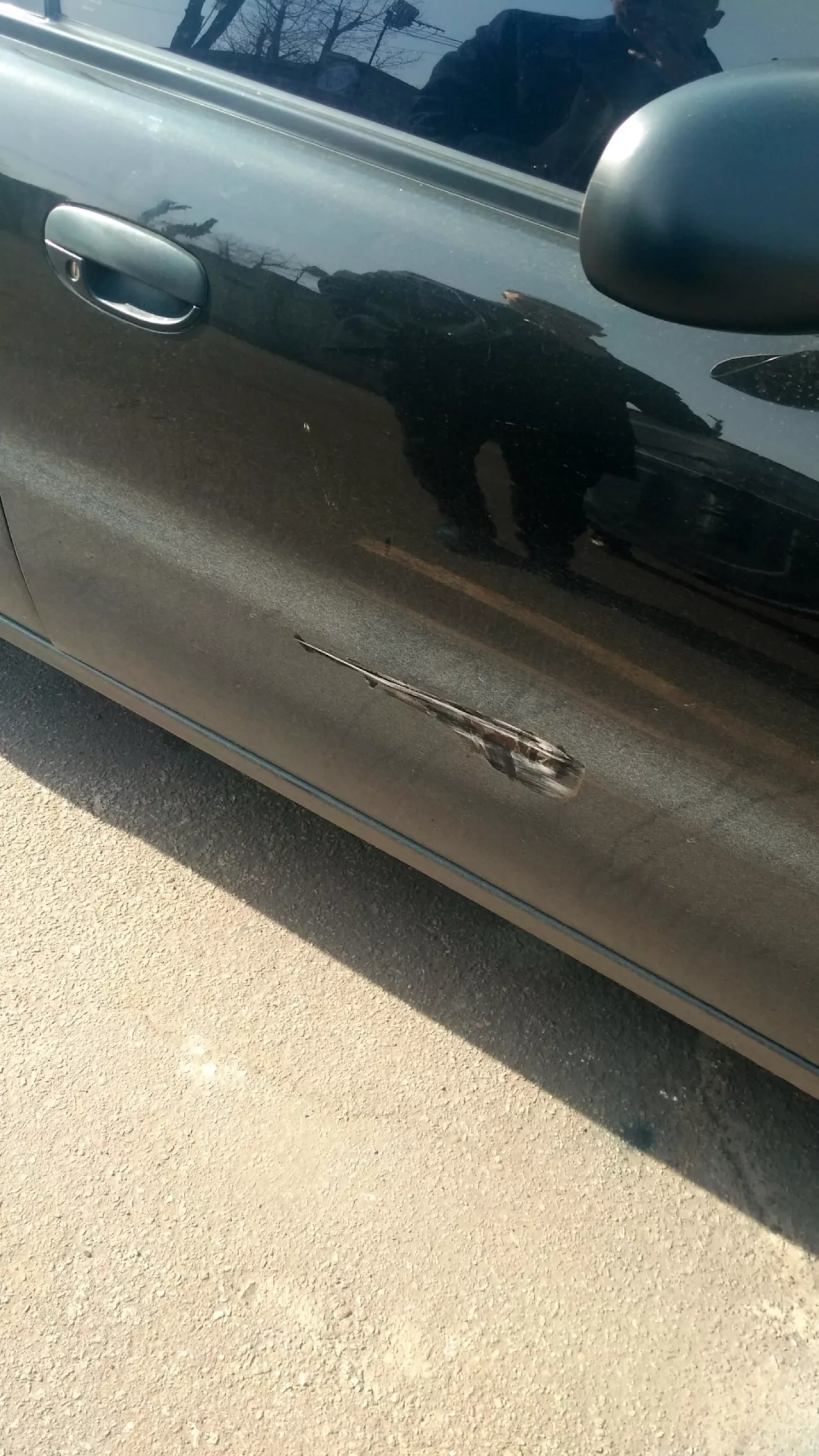 Всем привет. Я как водитель с небольшим стажем вождения был собой доволен, что ездил аккуратно и за год вождения нигде не поцарапал и не ударил машину. Но вот этот день настал. Я просто на просто спешил, а на стоянке не было места вообще, только два места для инвалидов. Ну я и занял одно из них. За 10 минут порешал свои дела и смотрю, что меня сзади подперли два автомобиля. Визуально смотрю — выехать смогу. Потихоньку сдаю назад, перед этим поленился опустить зеркало вниз, и цепляю пассажирскую дверь об бампер девятки. Сразу я не стал выходить и смотреть, думаю приеду уже домой и посмотрю. Всю дорогу еду и думаю: «лишь бы там была незаметная царапина». Выхожу, смотрю а там :