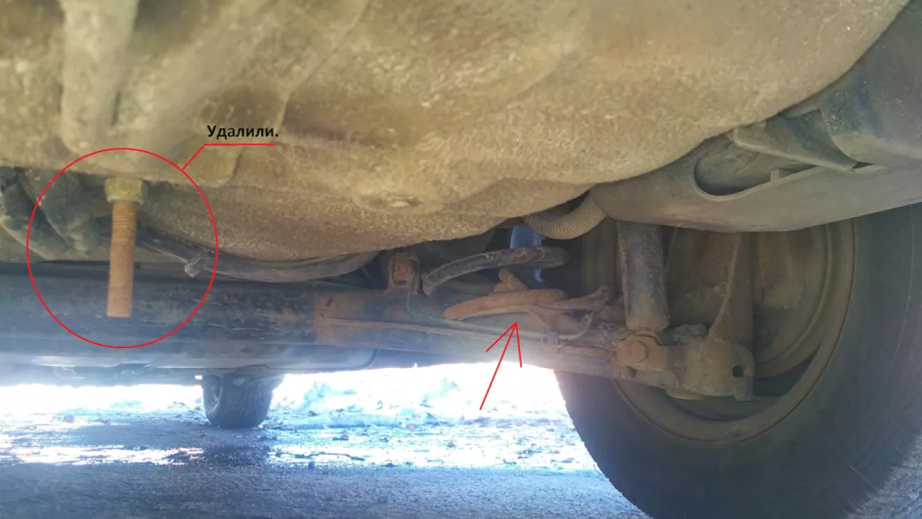Вот и у меня произошла такая ситуация. Заметил и ездил я так дня три. Звук «звенящего» ключа в багажнике. Перебрал все в багажнике, звенит, еще раз все переложил, звенит. Самое смешное что я это все делал перед и после работы, чтобы в дороге тестировать. Я не мог понять в чем дело и на помощь я позвал mrPipe . Мы полностью выложили все с багажника, остался только газовый баллон. И поехали тестировать по нашим «хорошим» дорогам. Звук «звенящего» ключа в багажнике остался :) Осматриваем машину снизу и видим вот такую картину: