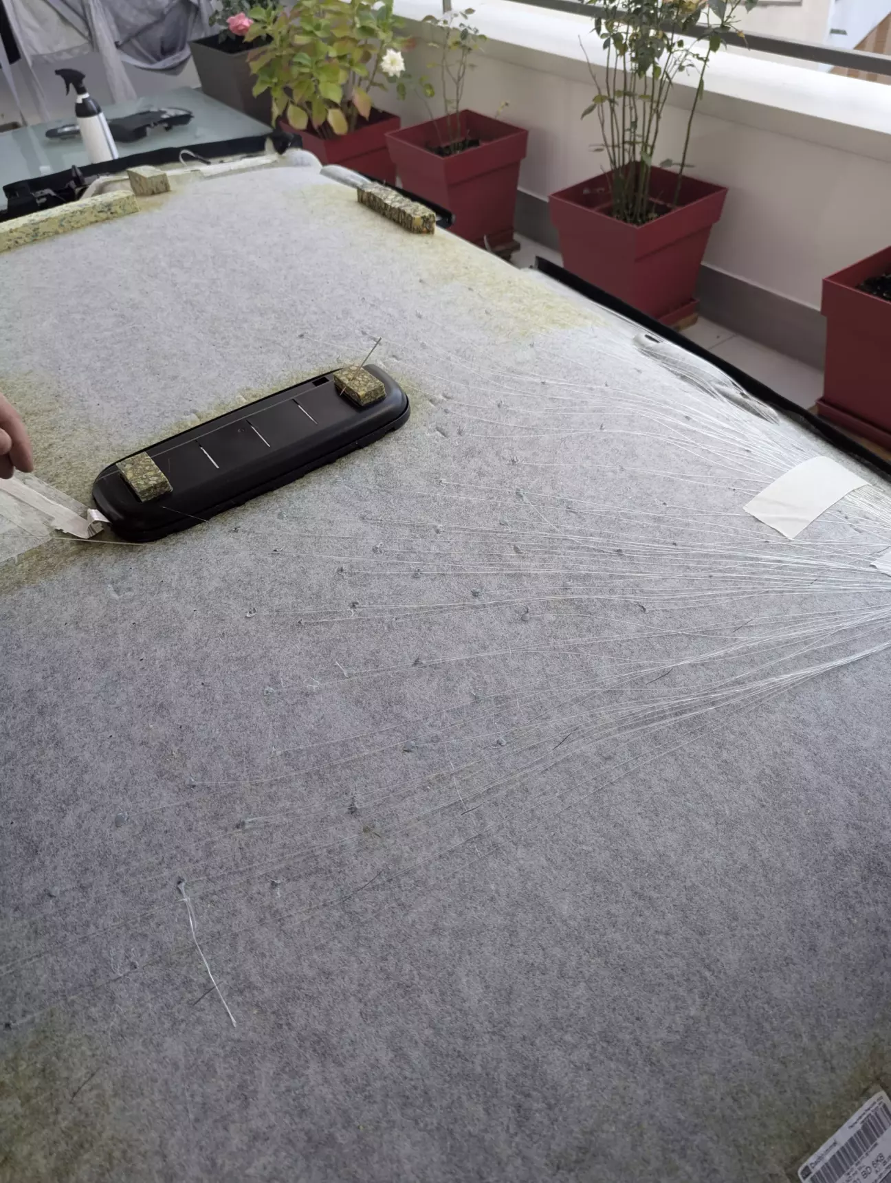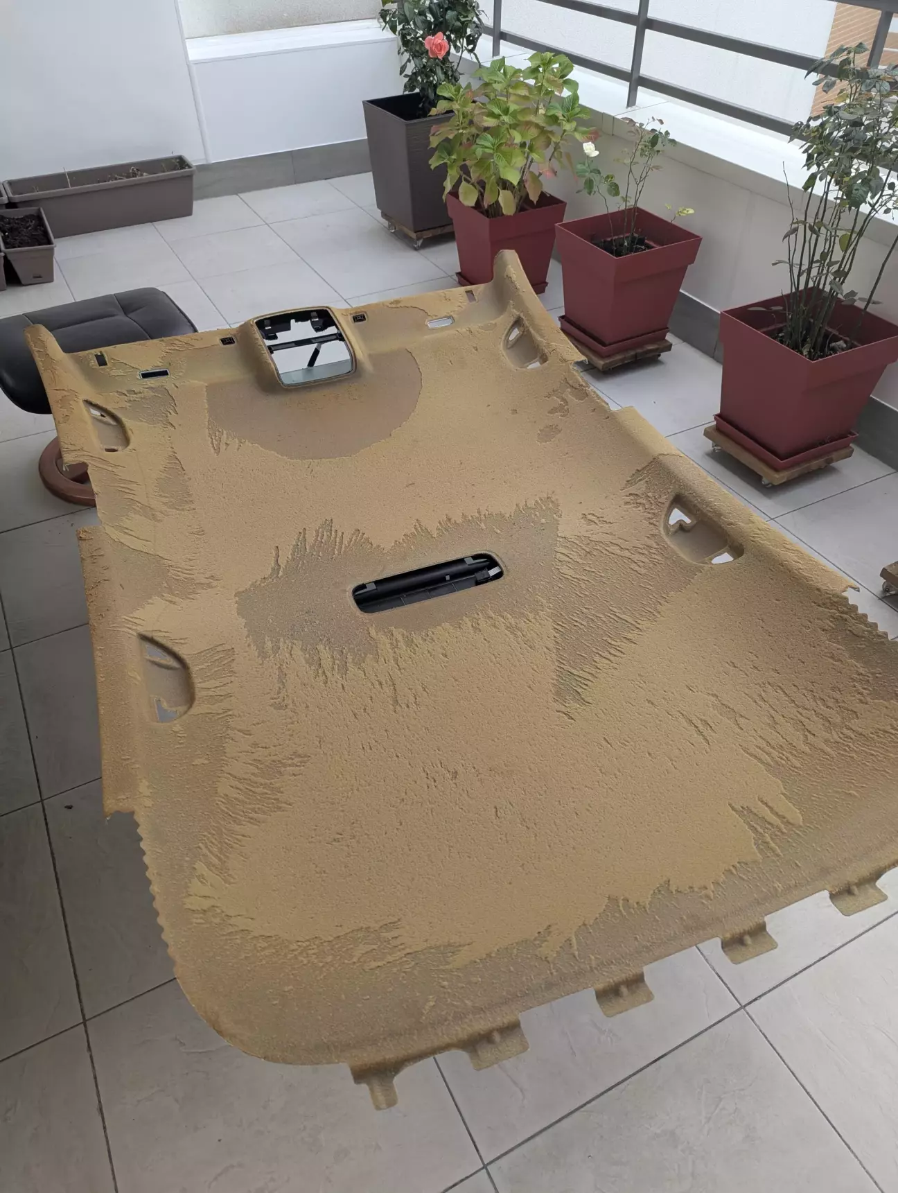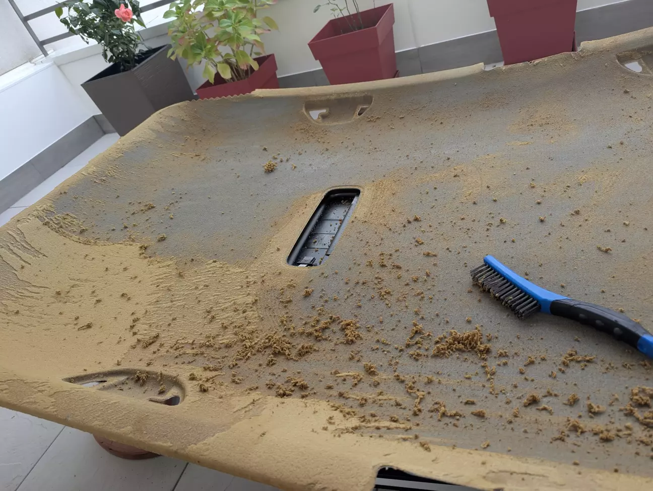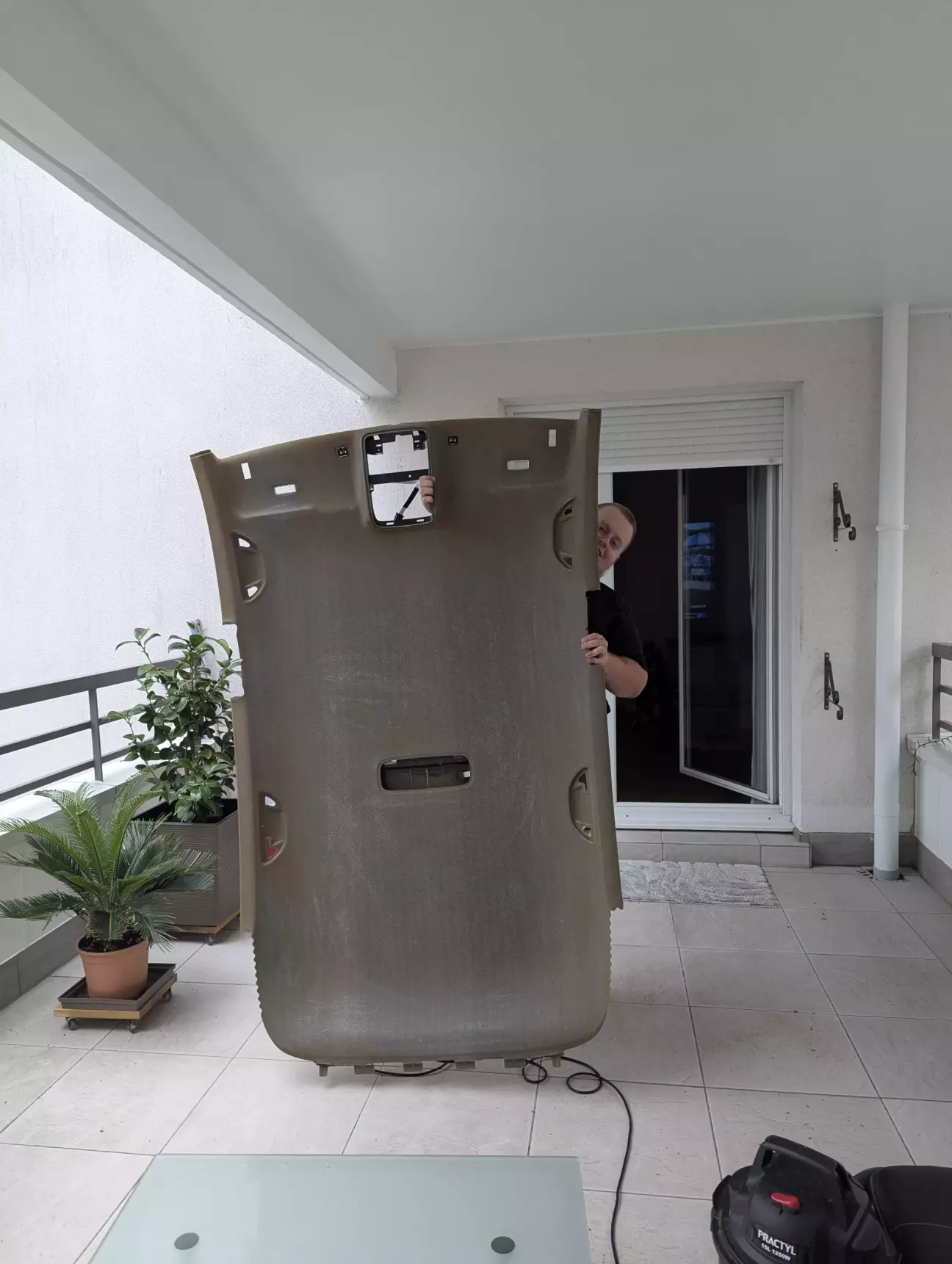 Зняття стелі зайняло десь пів години. Без жертв не обійшлося — два болти назавжди пішли в подорож десь всередину стійок, виніс стелю на балкон, і приступив до роботи, стара тканина злетіла за 5 секунд, а от зі старим клеєм (поролоном) довелося попітніти. Чистив металевою щіткою години 3-4, поки основа не стала чистою.