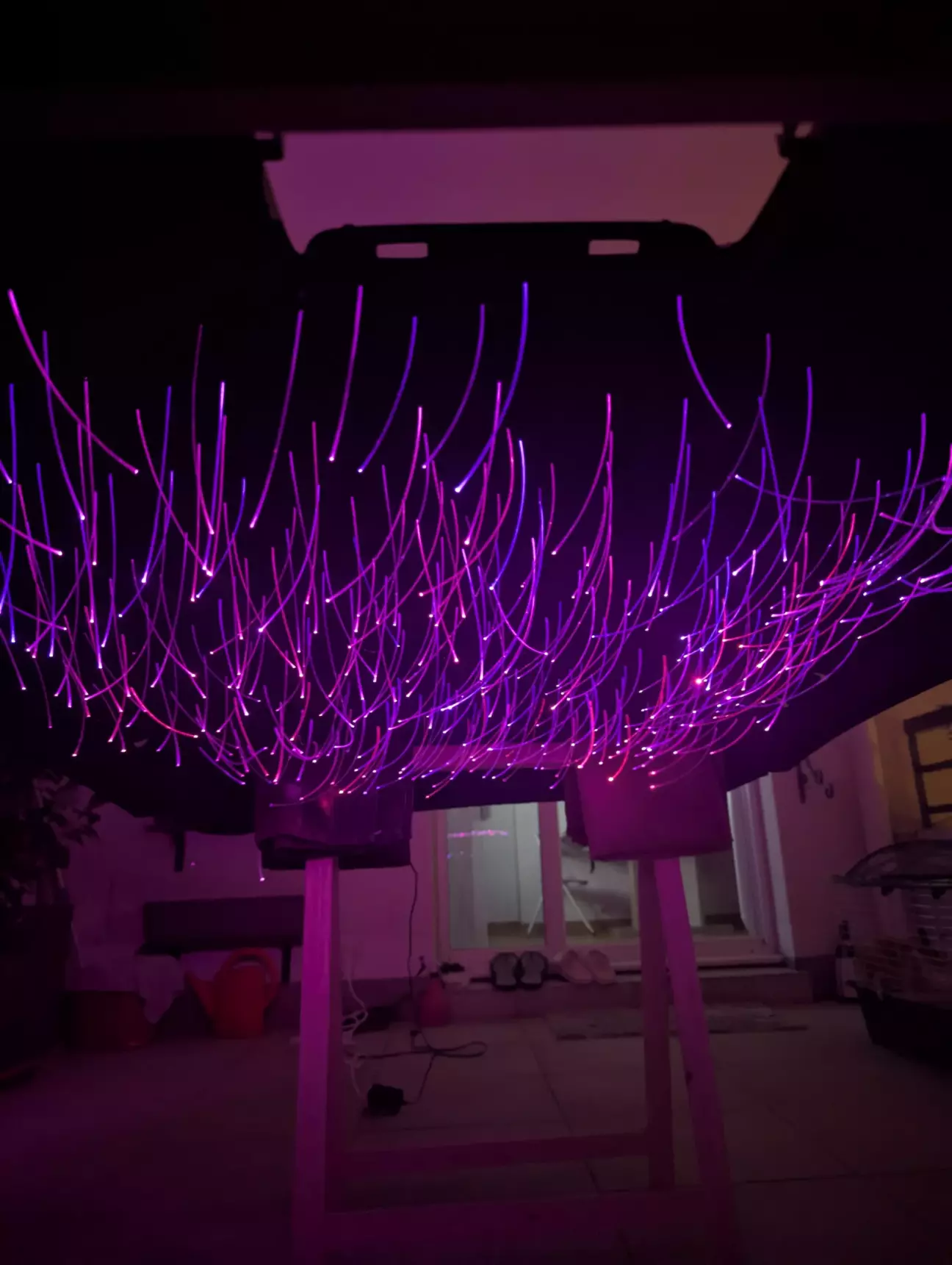 Оптика: Пропихаєш волокно, фіксуєш краплею гарячого клею з тильної сторони. Ще година монотонної роботи. Зверху додатково зафіксував пучки і лазер паперовим скотчем