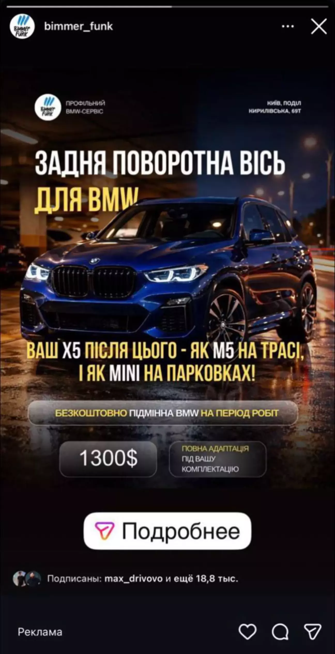 Але на цьому пригоди не завершились. Читаючи ТГ групи, натрапив на рекламу бімерфенк про встановлення задньої повертоючі вісі за 1300 доларів.