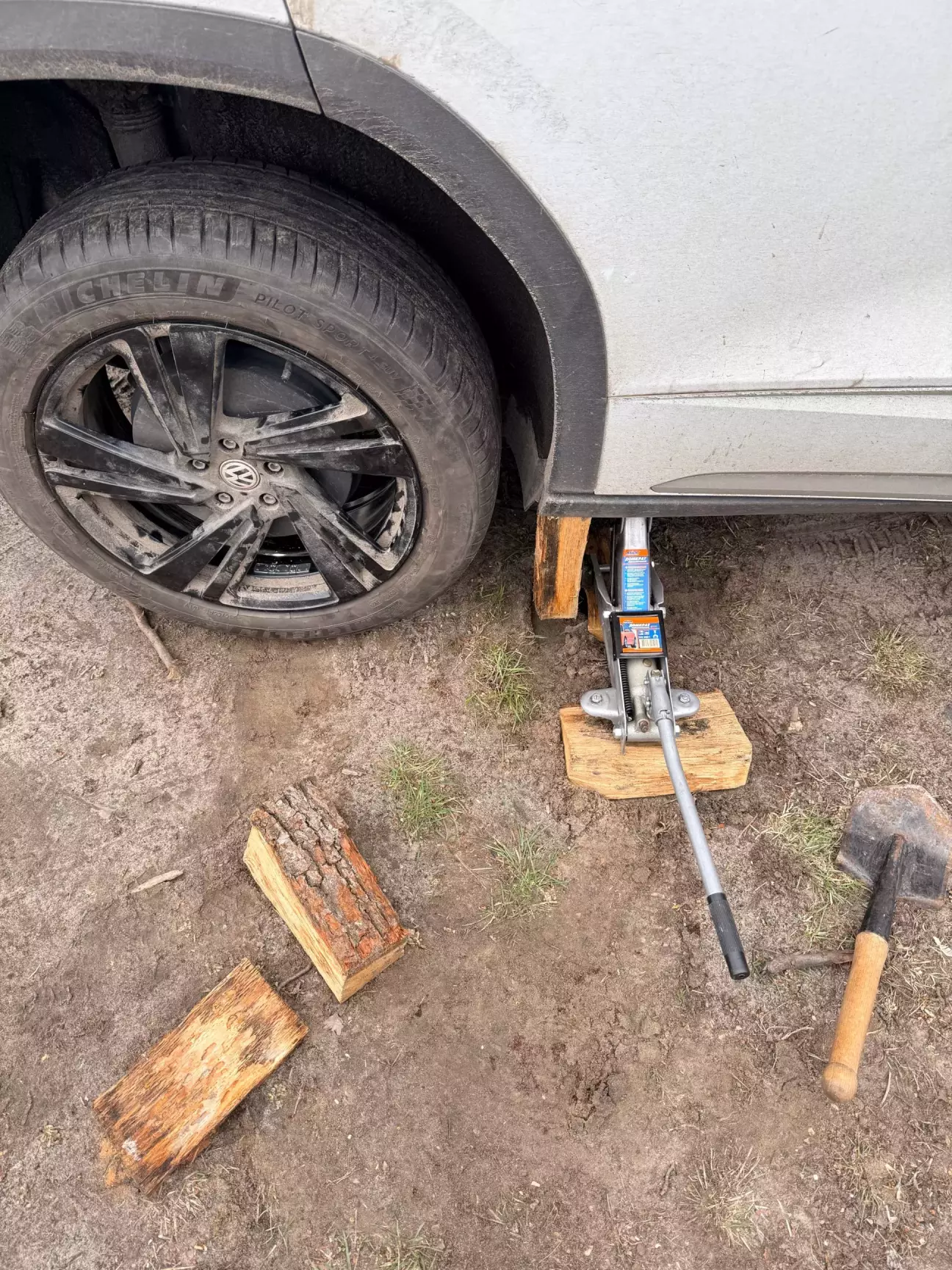 А ще авто зупинив на грунті і домкрат грузнув в нього, тому це забрало півгодини. Зняти спущене колесо ще було не важко, а от поставити з накачаною покришкою - проблема. А ще домкрат гідравлічний на 2 тони тупо перепускав і в максимальне положення не виходив, бо авто важке.