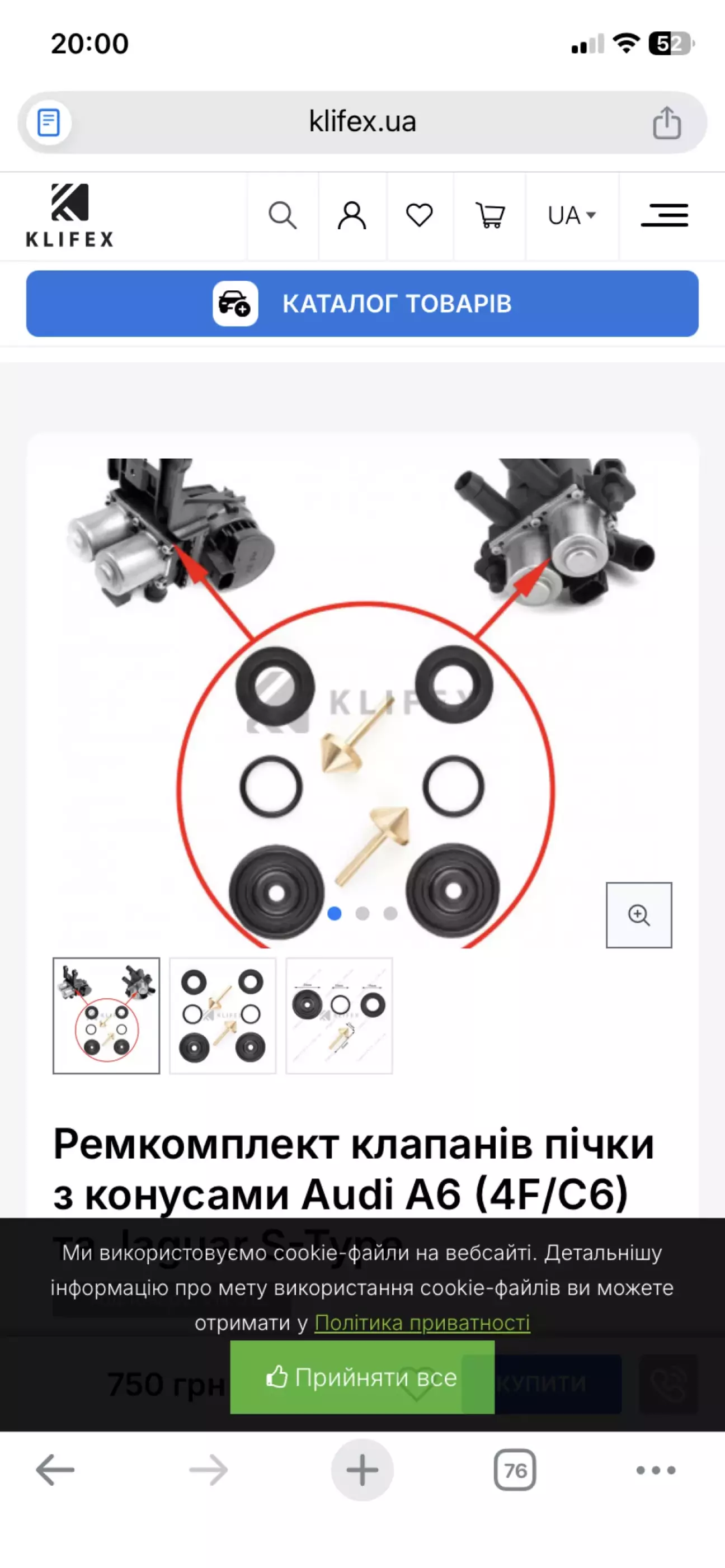 Доброго вечора аудисти. В березні настільки пригріло що на сонці авто почало сильно нагріватися і я накрутив температуру в салоні на мінімум для охолодження. Але з пічки все одно дуло теплим повітрям. Тим літом коли купив авто все було ок, кондиціонер гарно охолоджував у спеку, що ж сталося тепер? Почав вивчати питання, виявилося це ще одна хронічна болячка усих А6С6, а саме несправність клапанів пічки(оригінальний номер 4f1959617) які перестають нормально працювати через старість і бруд в антифризі. Клапан можна поміняти на новий(приблизно 8000грн), купити б/в за 2000-2500 або взяти ремкомплект і відремонтувати. Запитався на сто як краще, порадили купити ремкомплект фірми klifex, який я і придбав перед візитом на ремонт. Фірма українська, Київ але виробництво мабуть Китай. Прислали дуже швидко по НП, пакування гарне і добротне, ціна 750грн.