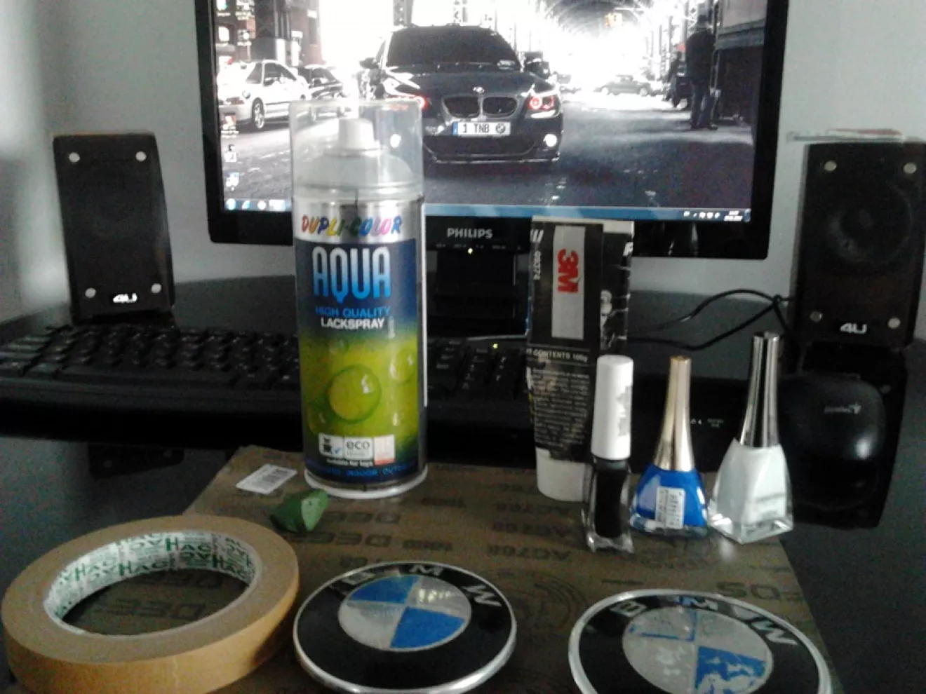 Давно раздражал мой ободранный значок БМВ. Так как значок оригинал 25 у.е я решил пойти чуть другим путем) Одним днем поехал в магазин, купил лаки для ногтей трех цветов, лак в баллончике, малярный скотч и шкурку с зернистостью 400,800,1500. Для полировки брал пасту гои и абразивную пасту 3м. Пробовал что лучше. В итоге 2 варианта хороши, у кого нет пасты гои пусть берут любую полировочную пасту. Так как у меня была 3м я взял ее.