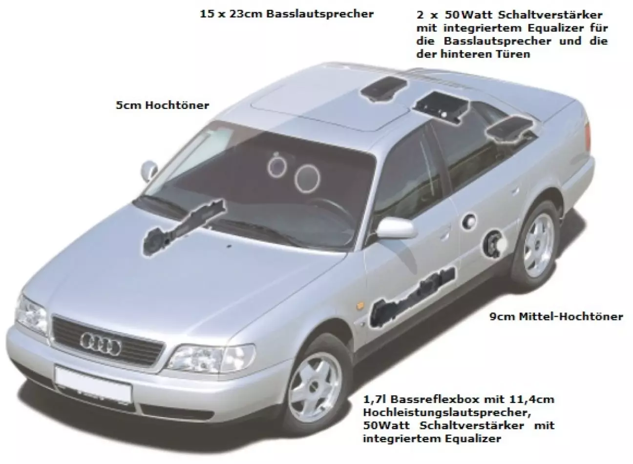 Підсилювачі для всіх динаміків — це окрема історія. В передніх дверях для кожного з динаміків він встановлений окремо. Самі підсилювачі встановлені в штатних корпусах, в окремому відсіку, закриті від пилу і вологи, що потрапляє всередину дверей.