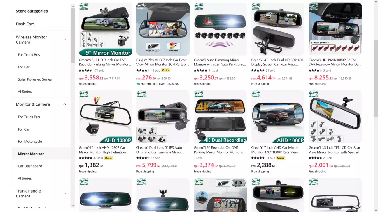 Та після років трьох перманентного колупання Мережі в, уже здавалось, майже безнадійних пошуках, якось натрапив на схвальні відгуки про камери заднього огляду китайського бренду GreenYi. Знайшов їх магазин на Аліекспресі, і опа: а вони й реар в`ю мірор монітор двр роблять! Та ще й вигляд цілком старовірний, як треба.