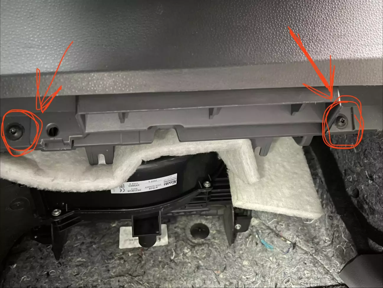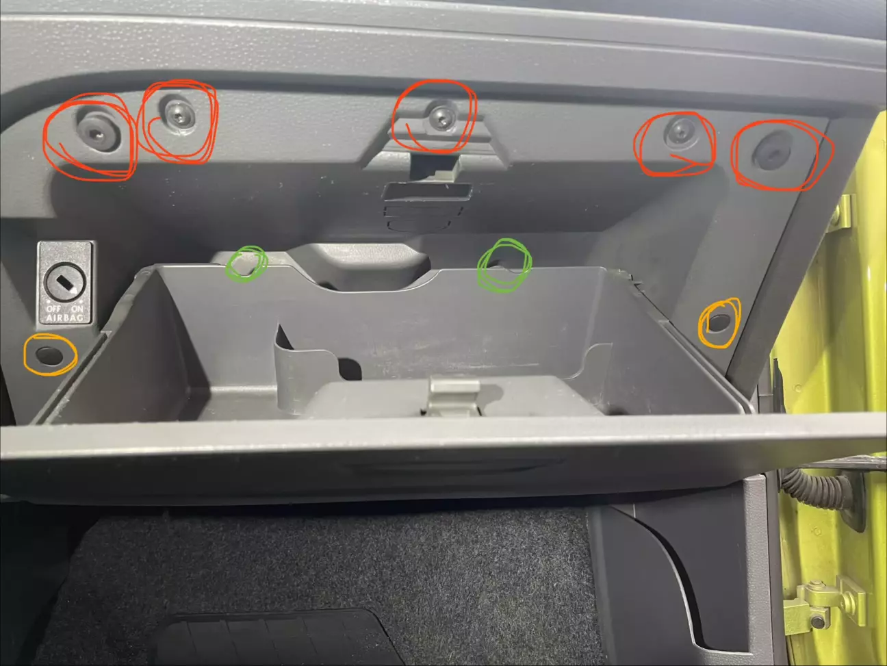 закреплены саморезом к моторному щиту - их я тоже перевесил в другое место но звук не исчез. Решил снять бардачек и поискать проблему там. Значит из минусов обнаружил то что у меня нет подсветки бардачка впринципе( Где какие саморезы нужно открутить я указал на фото, желтым указал две клипсы а зеленым два торкса пожирнее на задней стенке