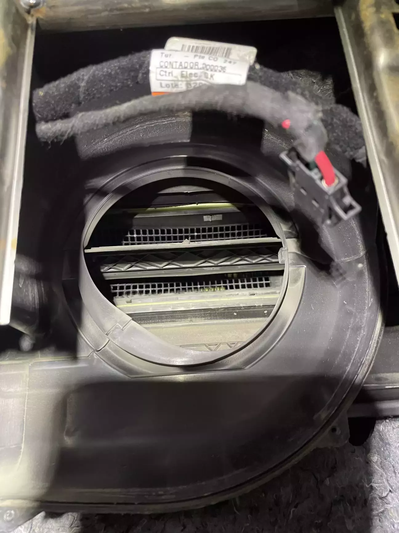 За бардачком будет видно моторчик печки, у него по кругу откручиваться несколько мелких светлых саморезов (штук 5 или 6) и провернув его немного получилось достать оттуда. Открывается вот такой вид: