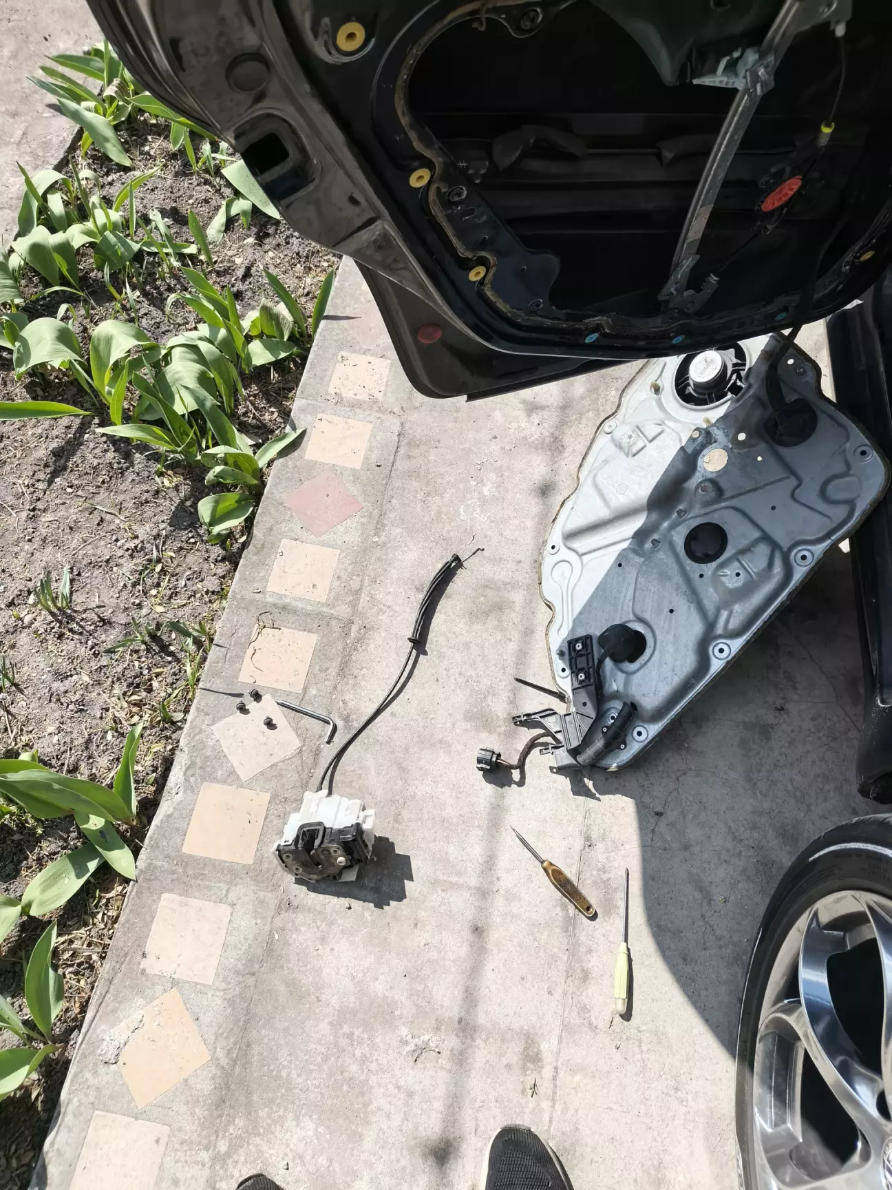 Спочатку знімаємо дверну карту, потім відкручуємо сам обмежувач від дверей і від кузова. Далі відкручуємо і знімаємо моторчик склопідйомника. Далі потрібно прогнути вусики кріплення склопідйомника і вдавити їх всередину щоб вони провалилися в металеву кришку дверної карти. Потім відкручуємо болти які кріплять саму металеву кришку, приспускаємо її вниз і отримаємо змогу дістати сам обмежувач. Оскільки я хотів ще й змастити замок то вирішив дістати і його, почав відщелкувати кліпси які тримають проводку, але як виявилося цього робити взагалі не обов'язково, достатньо просто відкрутити замок з тильної сторони дверей і тоді замок знімається разом із металевою пластиною, а далі вже можна від'єднати від нього проводку, дістати тросик, і працювати з ним окремо.