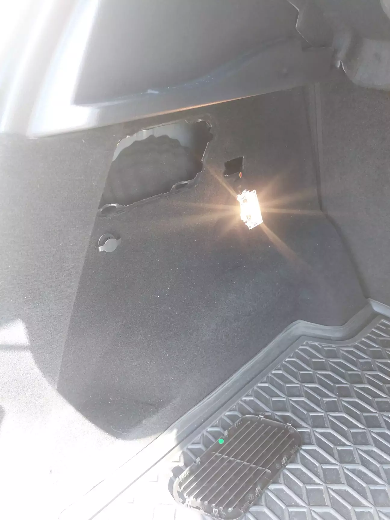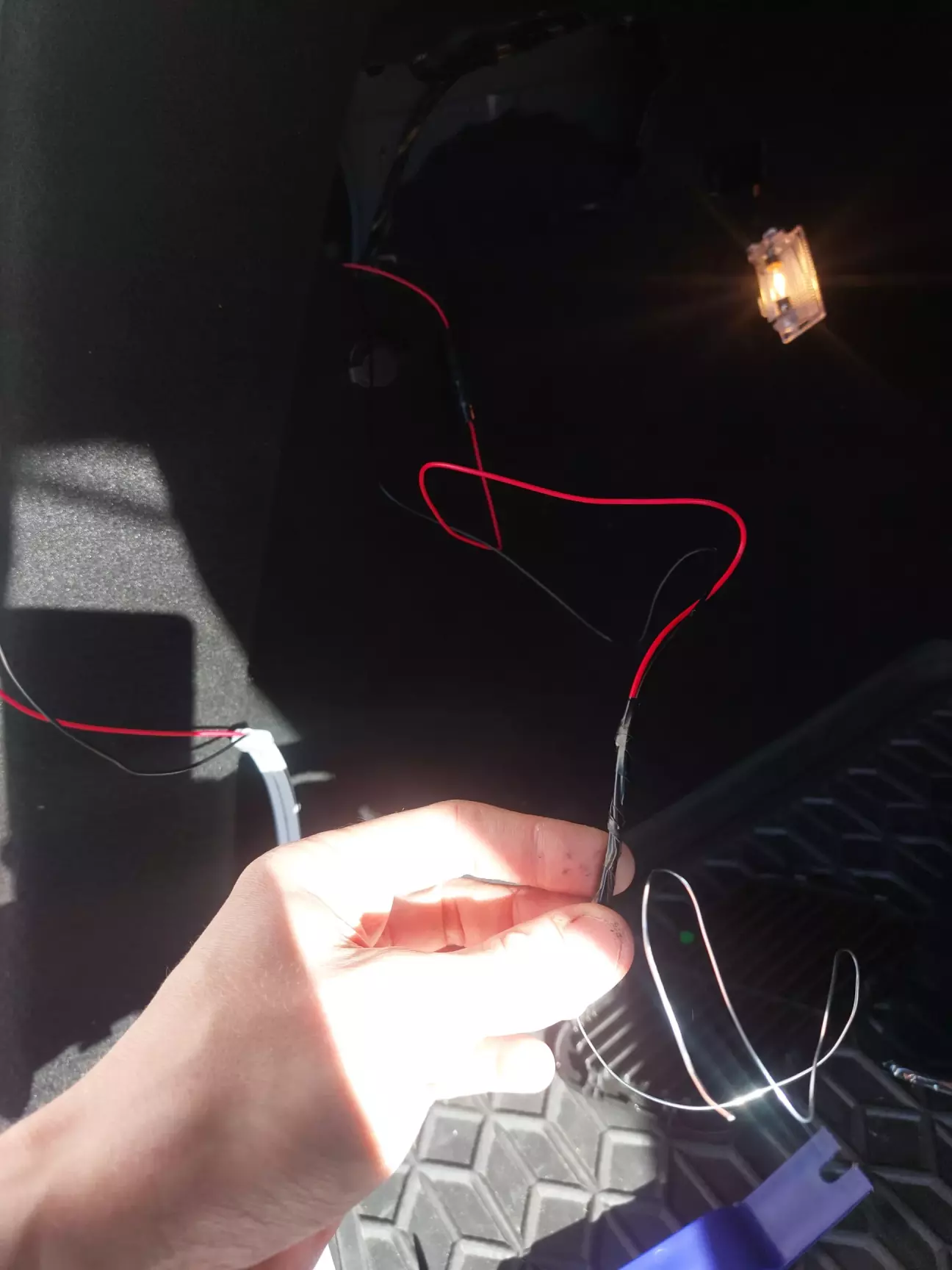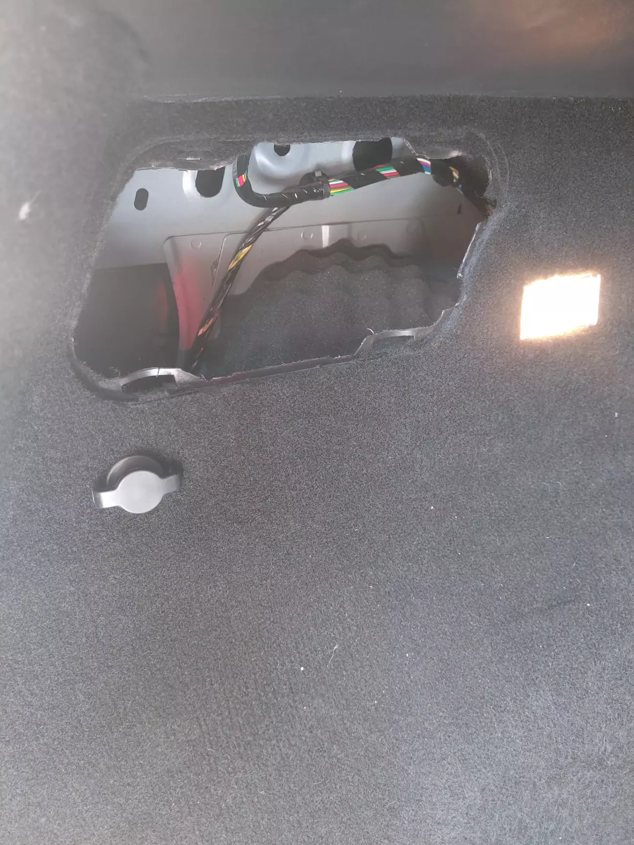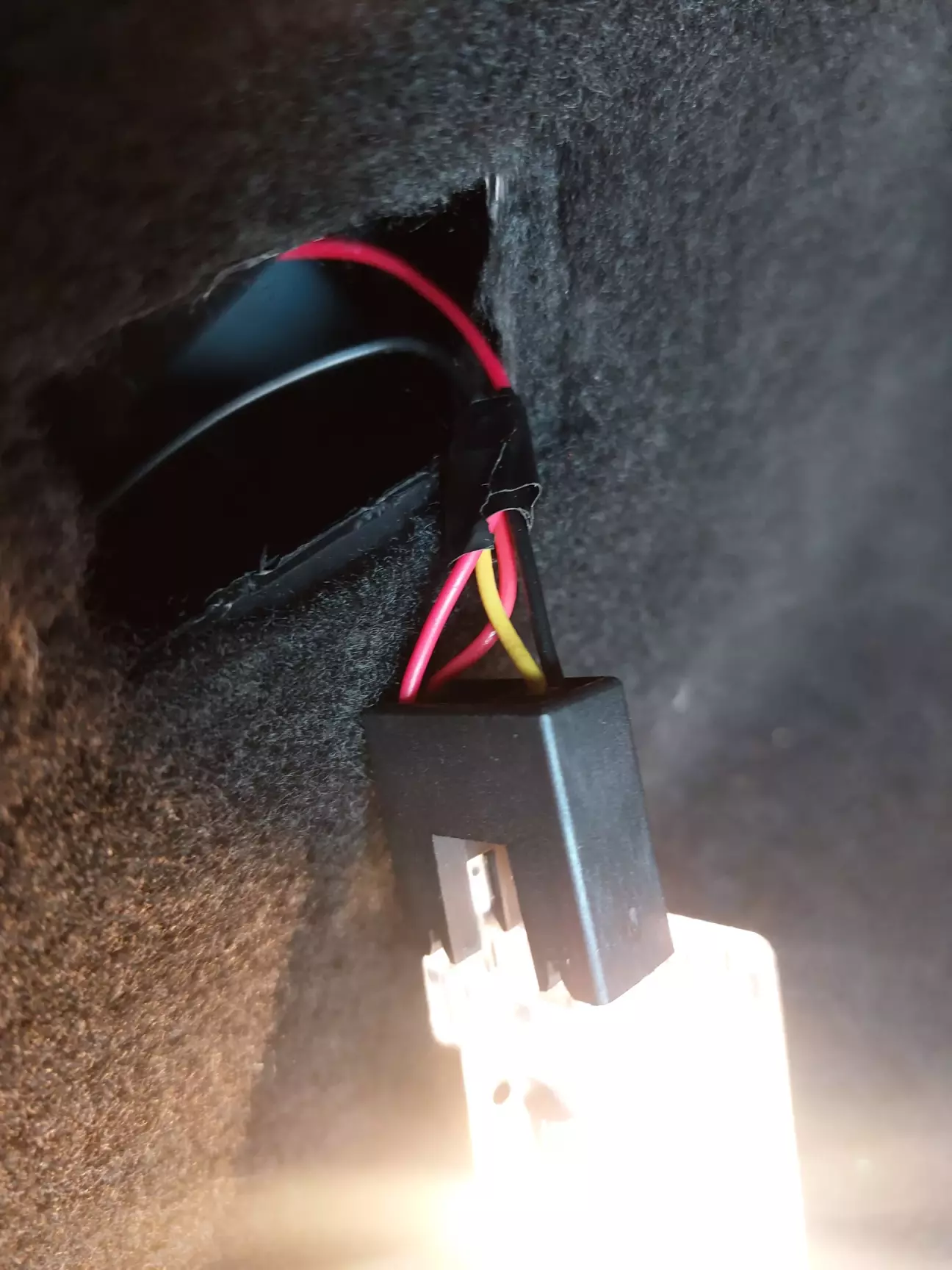 Зняв бокову кришку в багажнику, вітиг плафончик, протягнув дріт, вставив піни у відповідні місця в роз'ємі