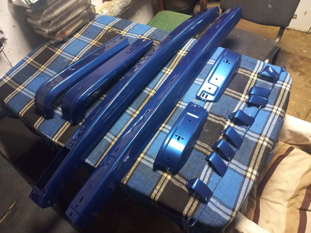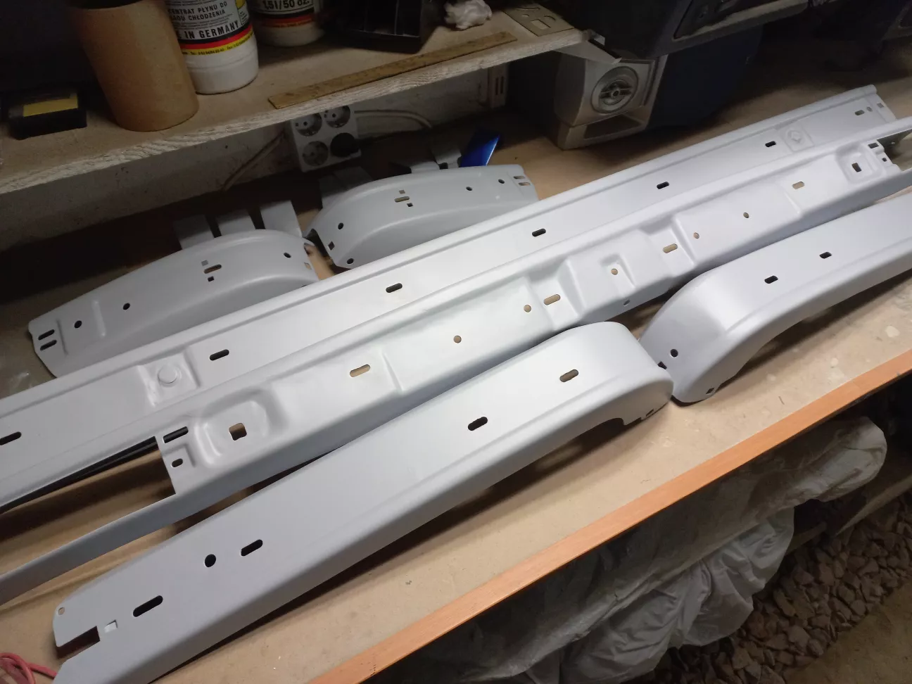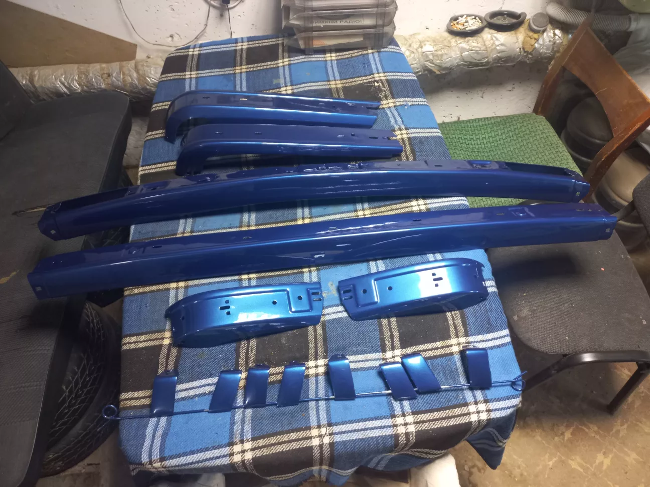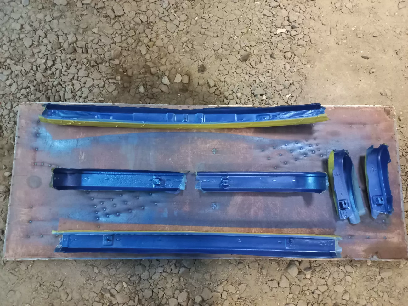 Попередньо, промисловим піскоструєм був повністю видалений хром. Потім бампери були оброблені перетворювачем ржавчини, очищені розчинником. Був нанесений аерозольний кислотний грунт, а потім аерозольний 2-компонентний акриловий грунт. Потім я, як зміг, пошпаклював дрібні дефекти на поверхні , і ще раз задув акриловим грунтом.