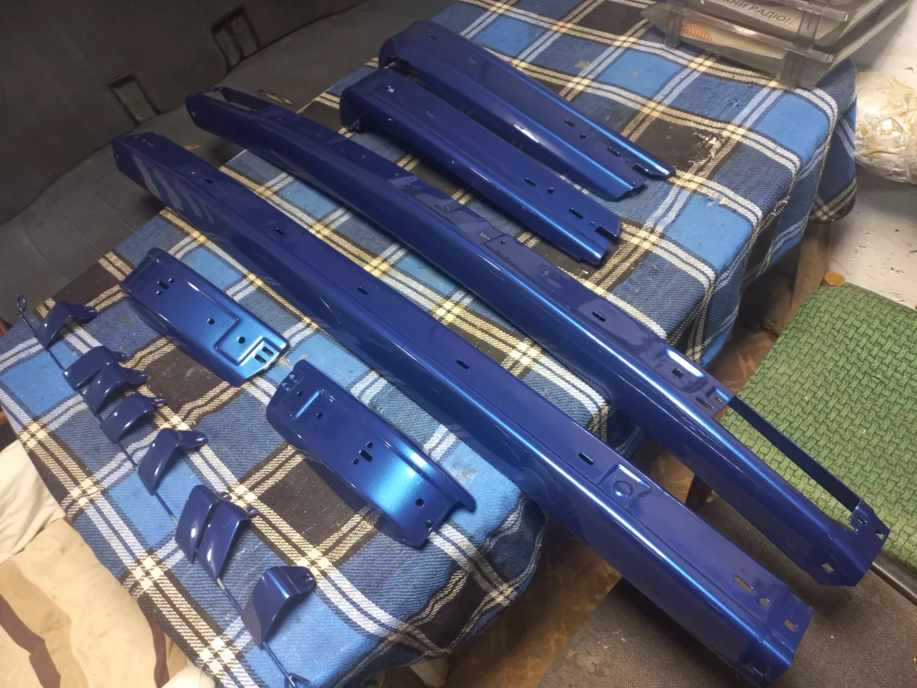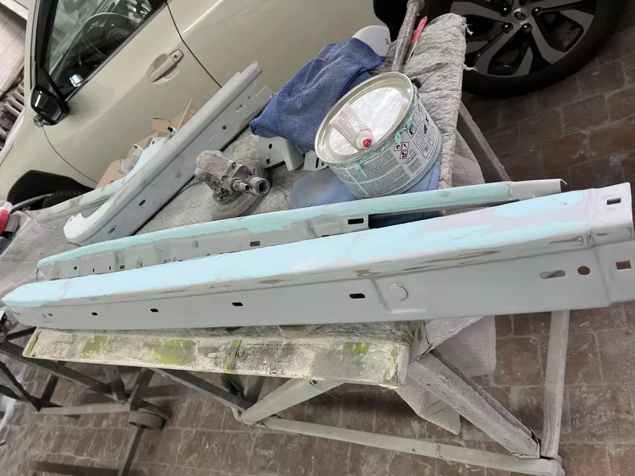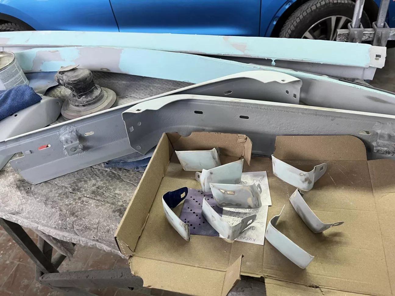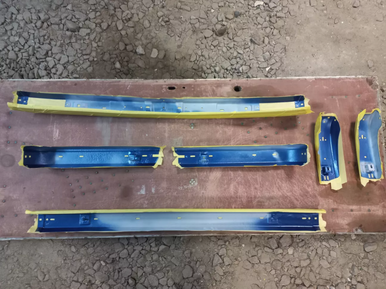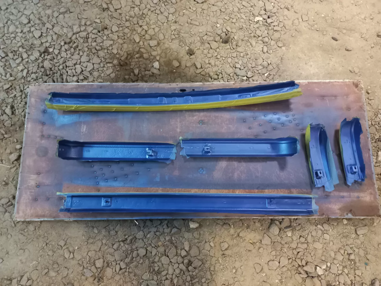 Попередньо, промисловим піскоструєм був повністю видалений хром. Потім бампери були оброблені перетворювачем ржавчини, очищені розчинником. Був нанесений аерозольний кислотний грунт, а потім аерозольний 2-компонентний акриловий грунт. Потім я, як зміг, пошпаклював дрібні дефекти на поверхні , і ще раз задув акриловим грунтом.