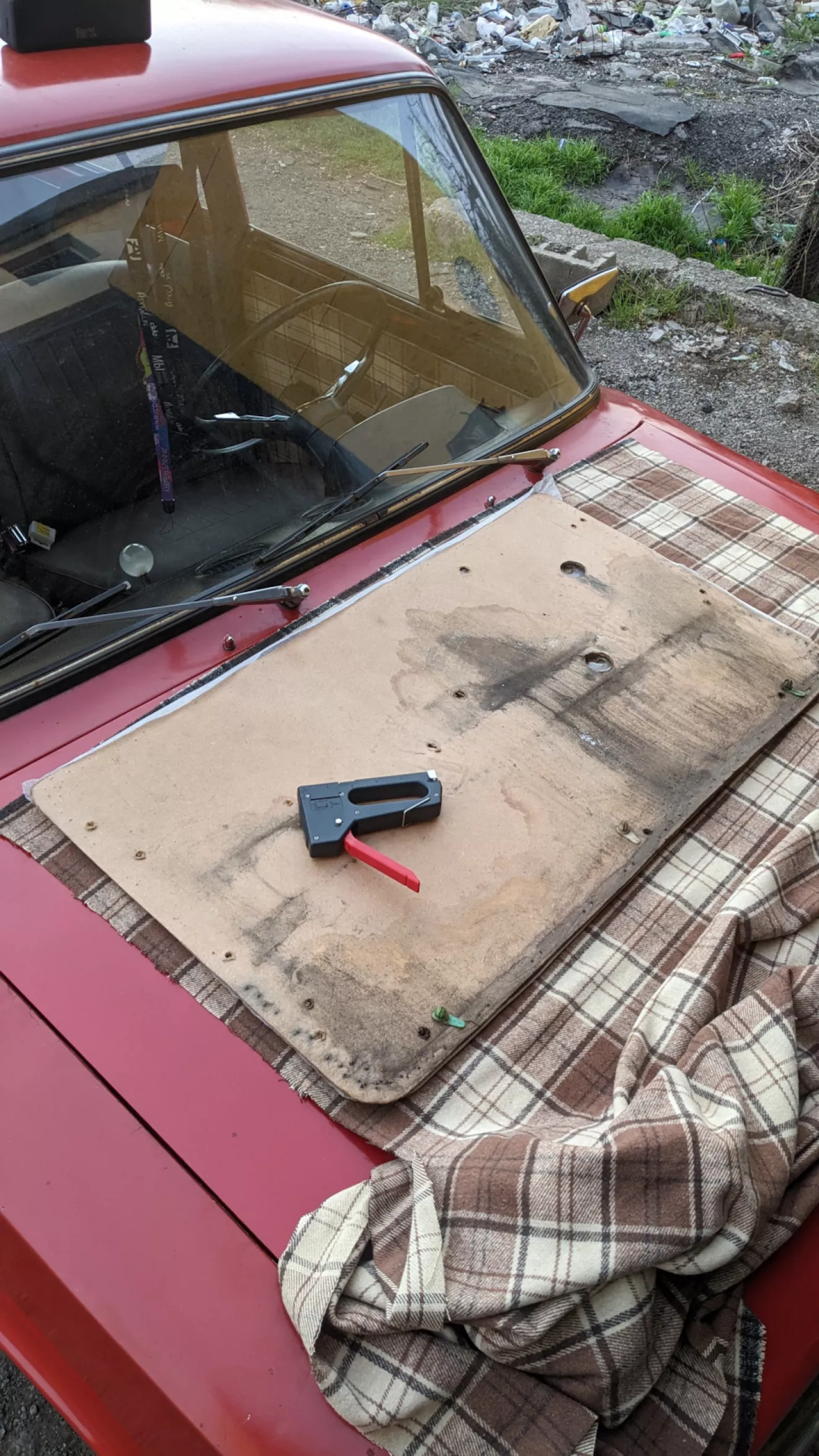 Сегодня все таки добрался до дверных карт, купил два метра относительно плотненькой ткани (1.5 метра ширина), снял с двпшки этот деРьмонтин и на маленькие скобы полетел обшивать по красивому)