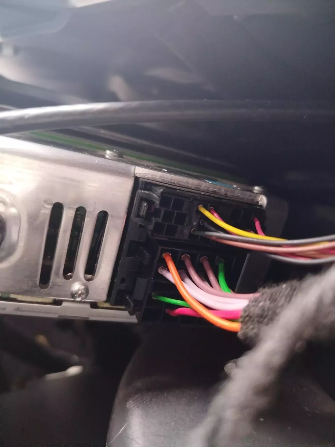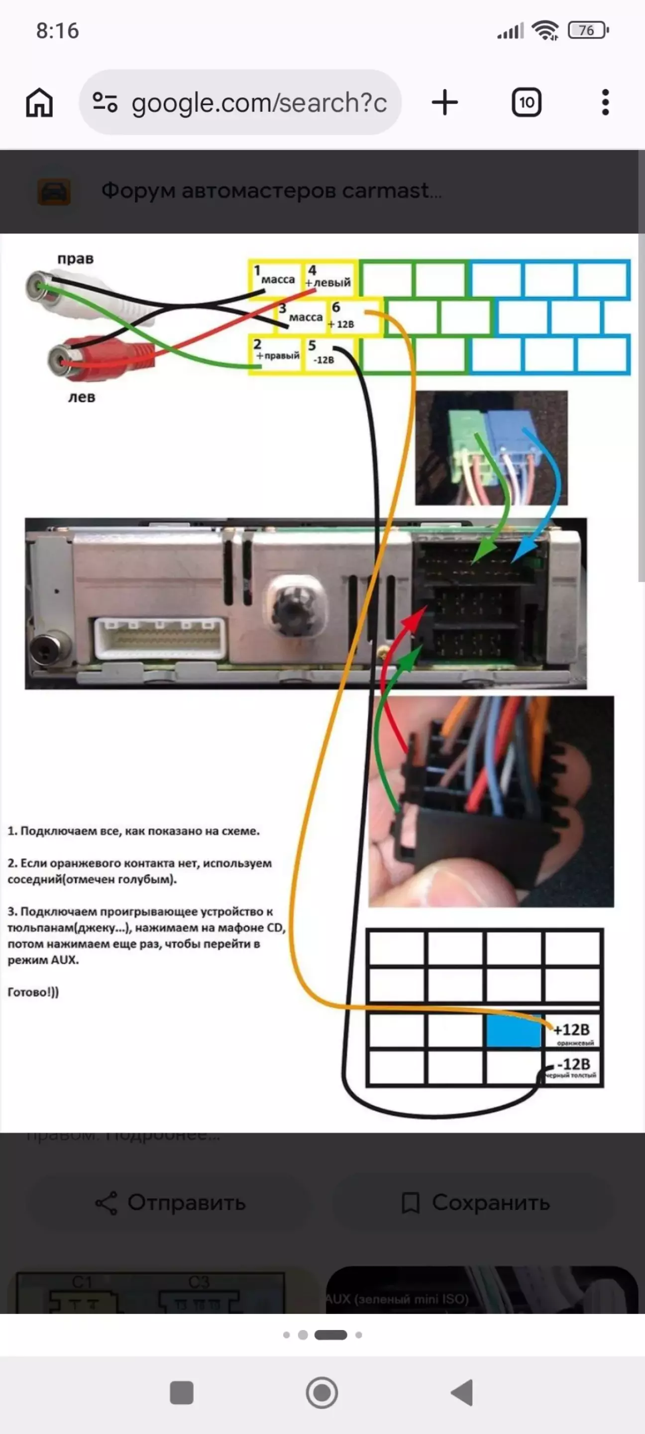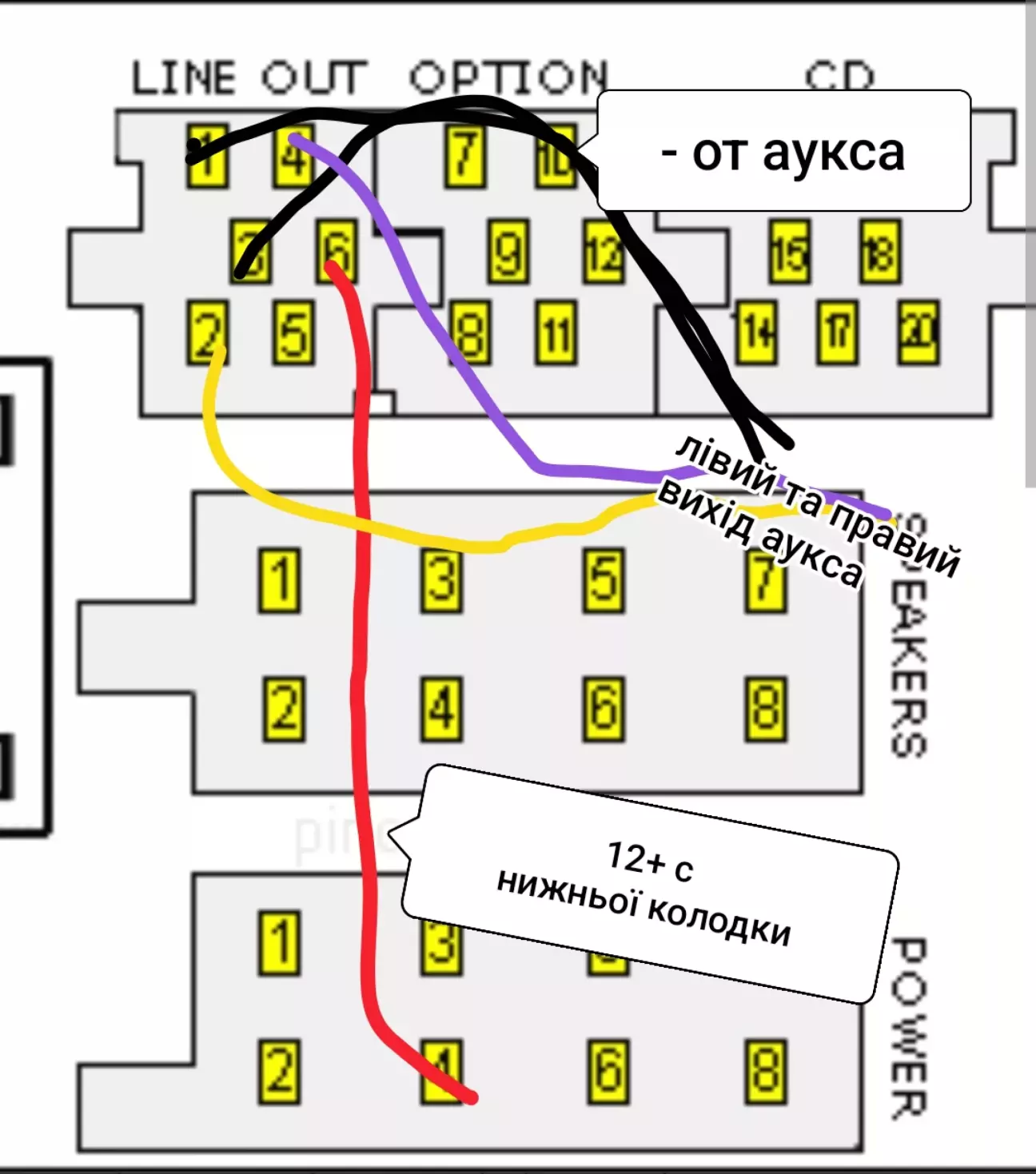 1та 3 провід з'єднав з - аукса. 4 та 2 правий та лівий канал( кольорові проводи) 5 не приєднував. 6 провід приєднував на авто до нижньої колодки до 4 чергового провода.