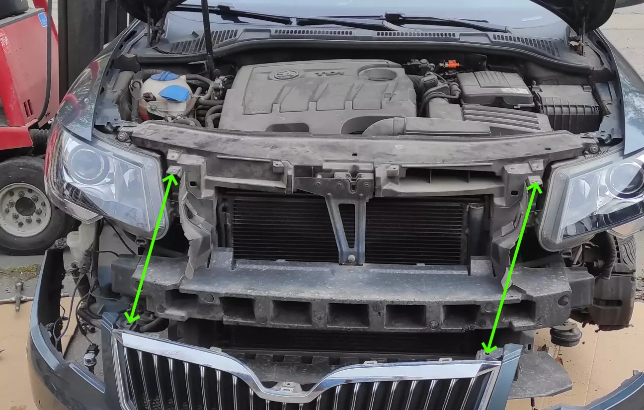 Далі знімаємо пістони накладки над решіткою, я використовував кусачки, щоб піддіти шляпки тих пістонів і знімаємо саму накладку. Під нею два болта кріплення бампера