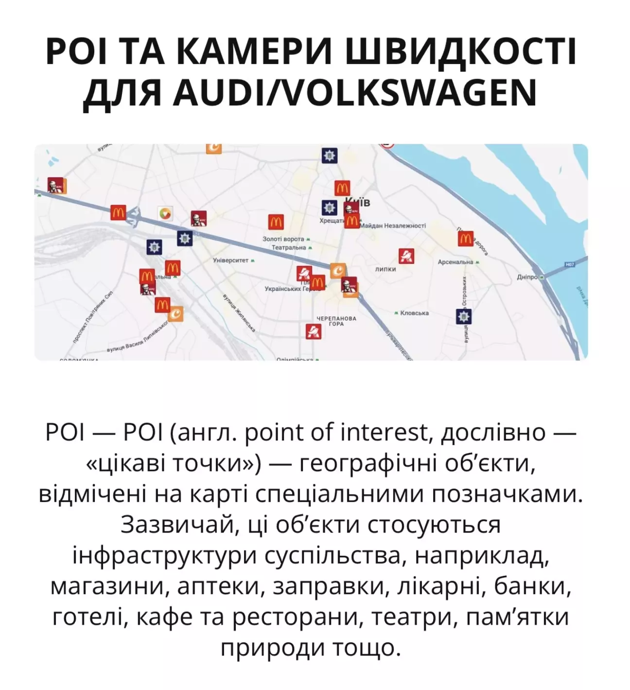 Щось підзабув про точки POI, давно не оновлював. Після оновлення баз навігації самий раз оновити. Для оновлення користуюсь цим ресурсом , зажди все чітко і без зайвих танців. Встановлення дуже просте, качаємо архів за посиланням☝️, разархівовуємо, кидаємо вміст папки (два файли) в корінь sd карти відформатованої в FAT32, вставляємо карту в слот sd1, заходимо в налаштування, відомості про систему, оновлення, обираємо sd1 та запускаємо оновлення. Оновлення займає приблизно пару хвилин часу. Оскільки мультимедіа у нас дає можливість відображення до 10 точок, то рекомендую в налаштуваннях навігації обрати саме ті, що треба вам.