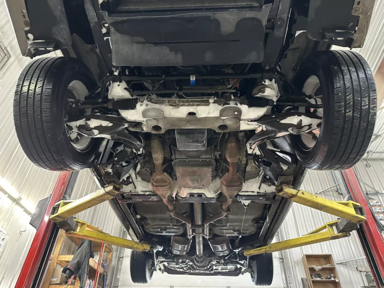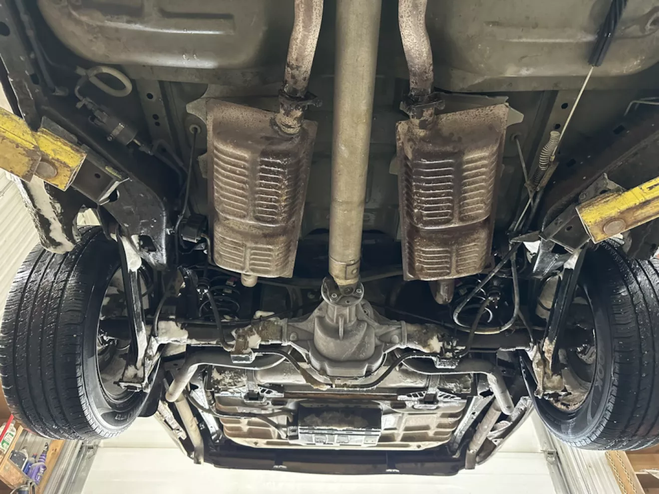 На следующий день уже на работе залез на подьемник и вставил чертовы трубы на место. Справедливости ради, трубы я при ремонте коробки не смог лежа на полу вставить полностью — видимо поэтому и выскочили. Боялся что также повредили подвеску заднюю или даже раму — на работе насмотрелся гнутых рам на пикапах, но тут все-таки пронесло. Раз уж заехал — по пути заменил масло — вместо 5 тысяч вышло 8, ну лучше поздно чем никогда. Сейчас на машине 178,000 пробега