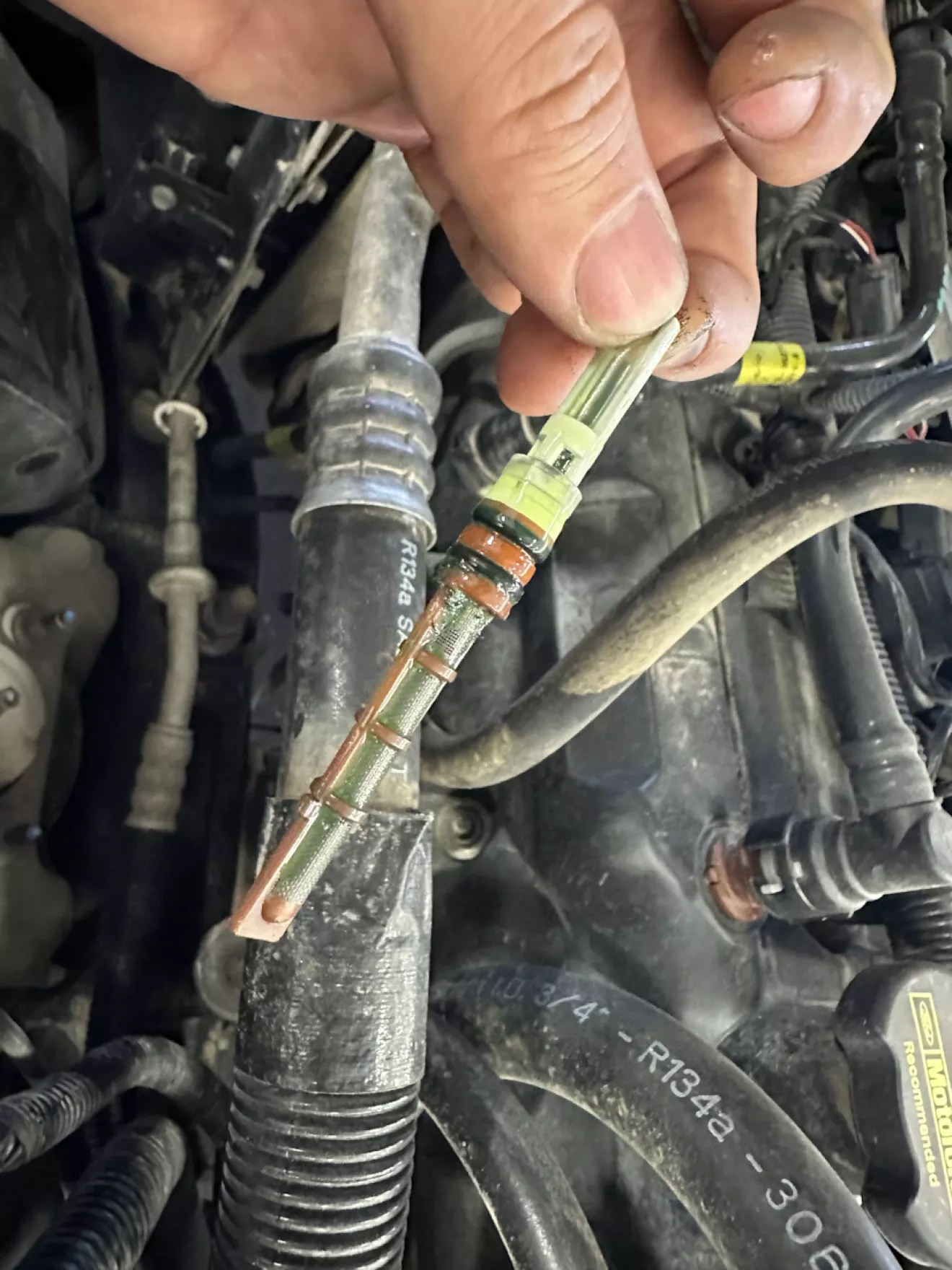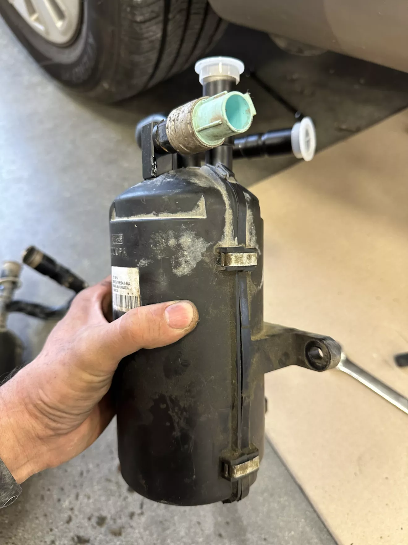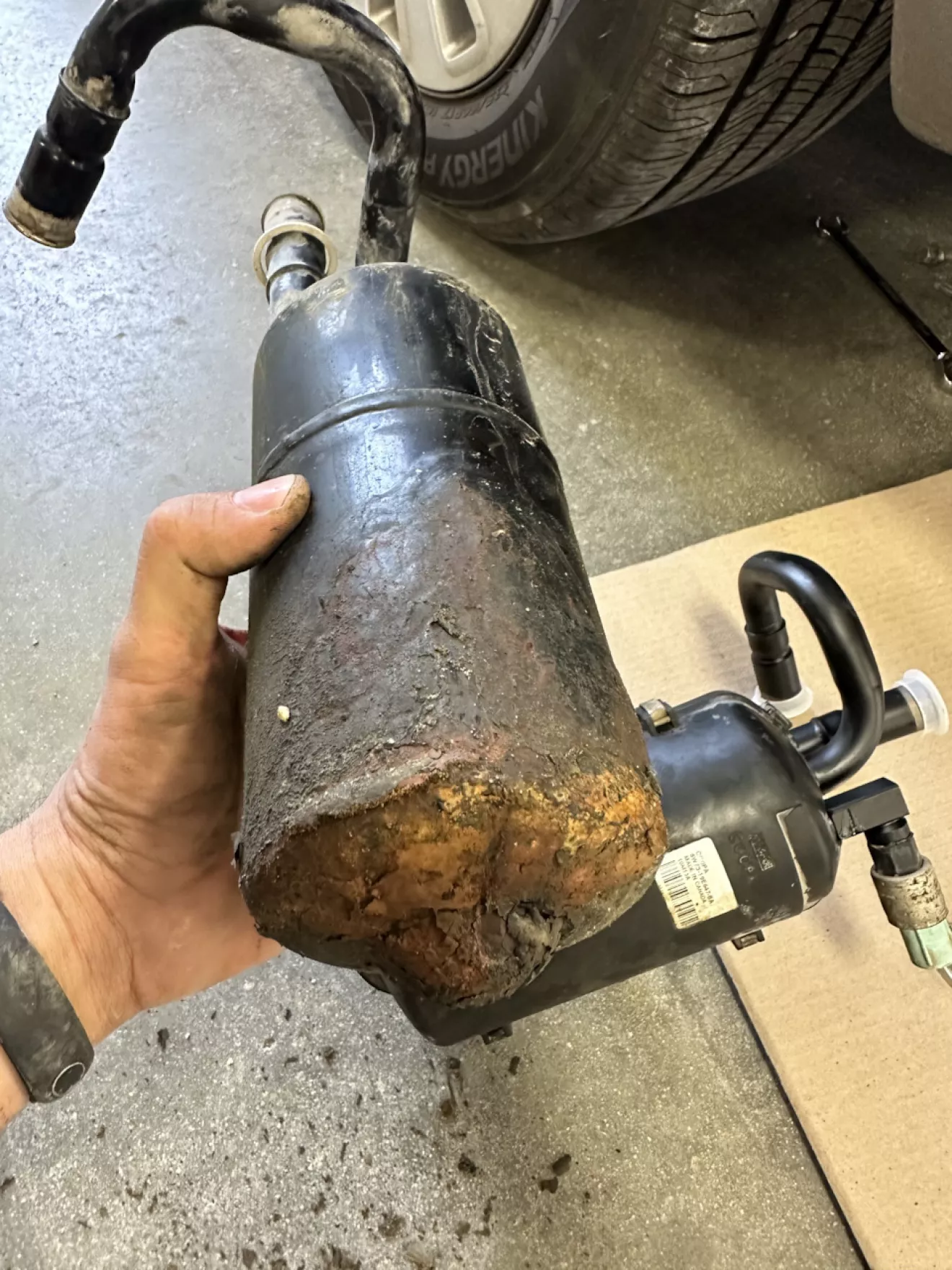 Когда покупал вику в мае, долго стояли прохладные дни и я както и не подумывал про кондиционер — он дул мягкой прохладой, я бывало даже включал печку. Когда же настали уже жаркие дни, ездить стало тяжко — оказалось что система в-общем пуста. Две недели я помаялся в жаре, но потом всетаки решил разобраться и записался в сервис продиагностировать систему. Там пришли к выводу что все дело в осушителе, сообщество в интернете поддакивало — самая ходовая запчасть в этой системе. Осушитель у Вики «одет» в пластиковый корпус, в котором этот потеющий при работе котелок постепенно сгнивает и лопается. Так и случилось — так что я пошел на амазон и через несколько дней получил новый осушитель и трубчатый фильтр, который не будет лишним поменять.
