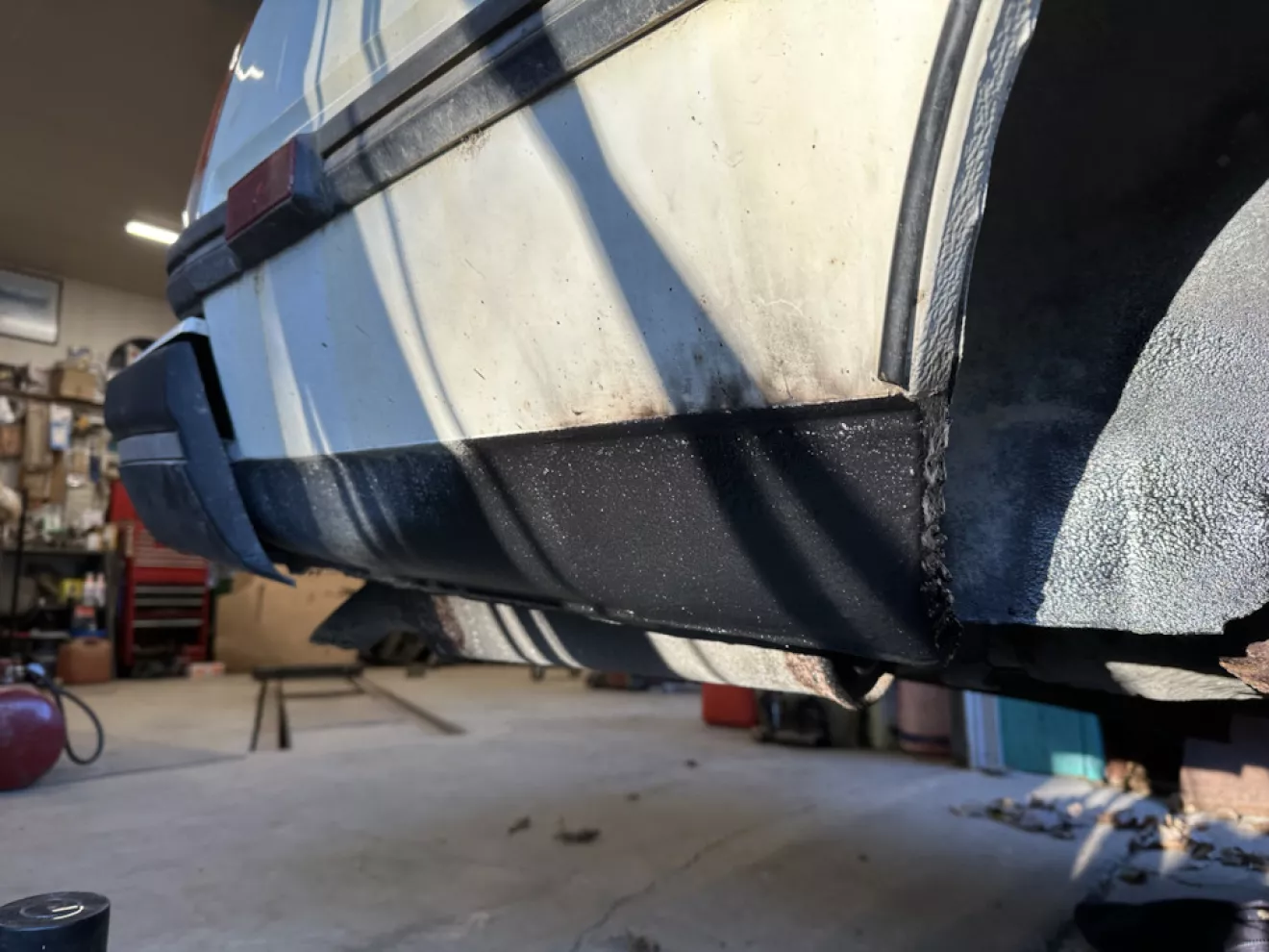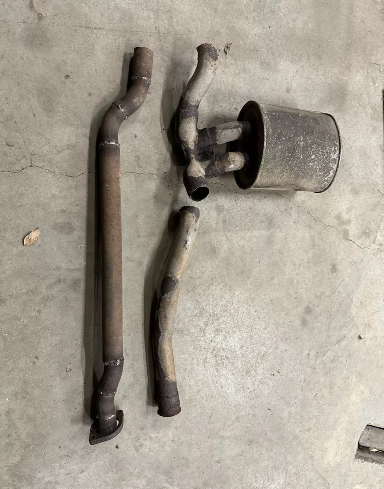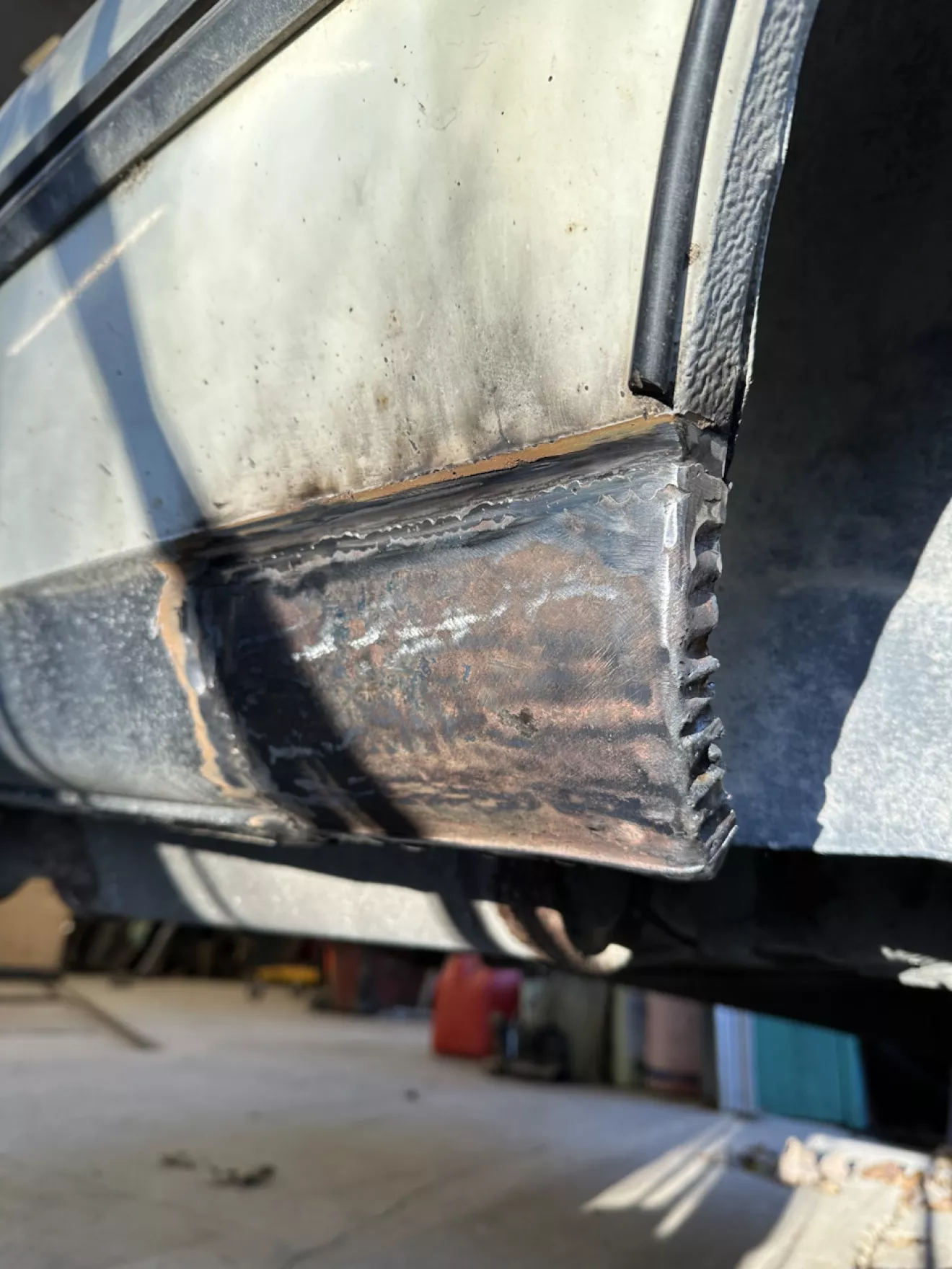 машину отогнали к знакомому домой, он живет в 50км, часть пути по грунтовкам — тогда еще не было своего места и многих инструментов, всетаки новое место. Нужно было восстановить сильно прогоревшую трубу, в заднем четвертаке заварить дырки. По пути разобрался в управлении бортовой аппаратурой (по первости не понимал как и думал что сломано). Здесь уместно добавить, что это не Сандей драйвер, это машина которая будет каждый день в 6 утра ездить на работу и летать по трассе куда нужно. Поэтому уровень ремонта, скажем, базовый)