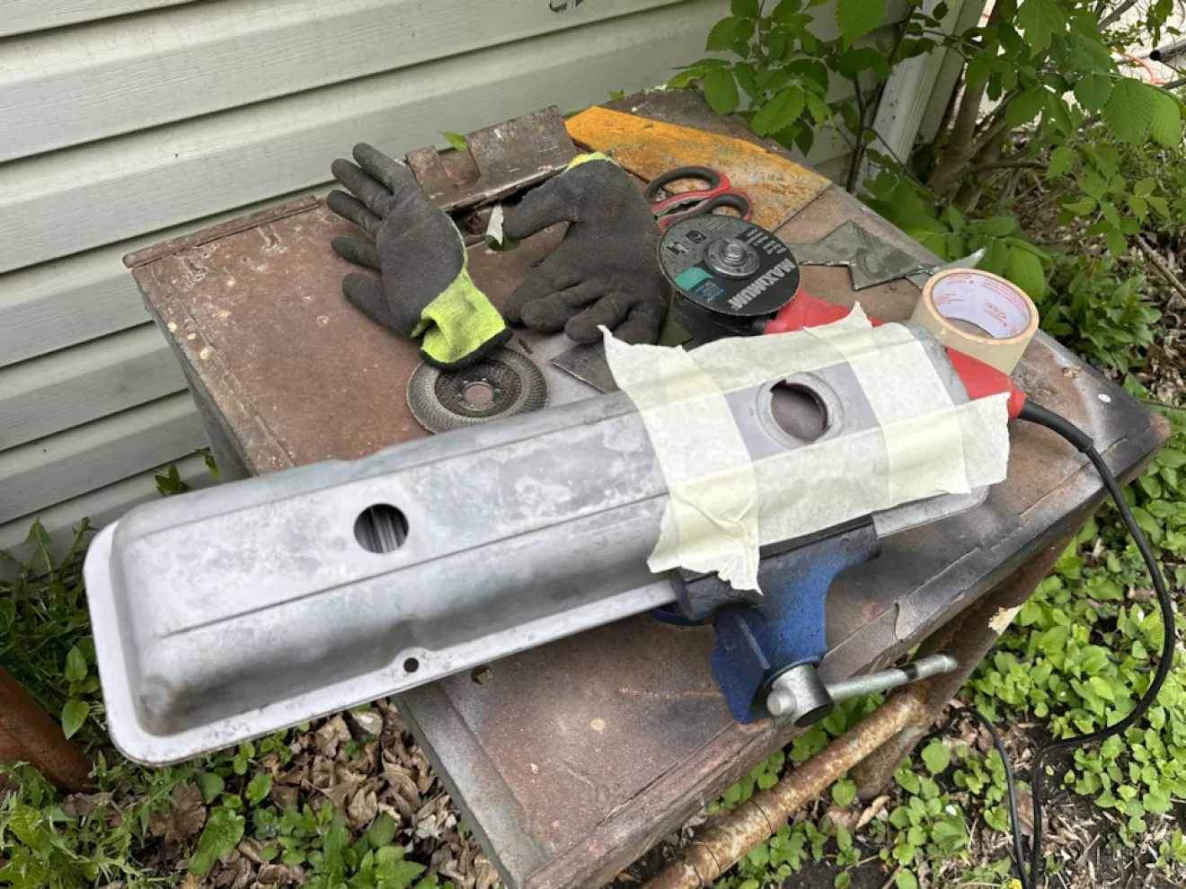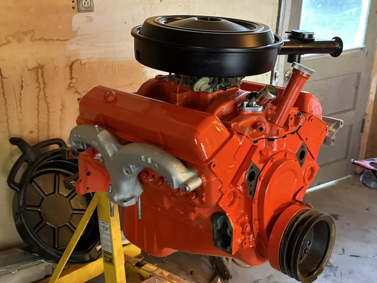 Также мне были нужны клапанные крышки. Так как у меня заливная горловина на впуске, мне нужны были олдскульные закрытые крышки, но с дырками под вентиляцию картера. На 327-ых двигателях и далее вентиляция закрытая и шланги с обоих подключены один в воздушник, второй в карб. Так как своих не было совсем, купил пару старых, где также была и дырка под пробку. Это пришлось устранить с помощью сварки, затем как обычно в грунт и краску. При покраске я также нанес 4 слоя глянцевого термоустойчивого лака поверх еще влажной краски — сработало (сухая краска от такого фокуса подрывается). Крышки по прошествии времени чуть-чуть более блестящие чем почти матовый движок.