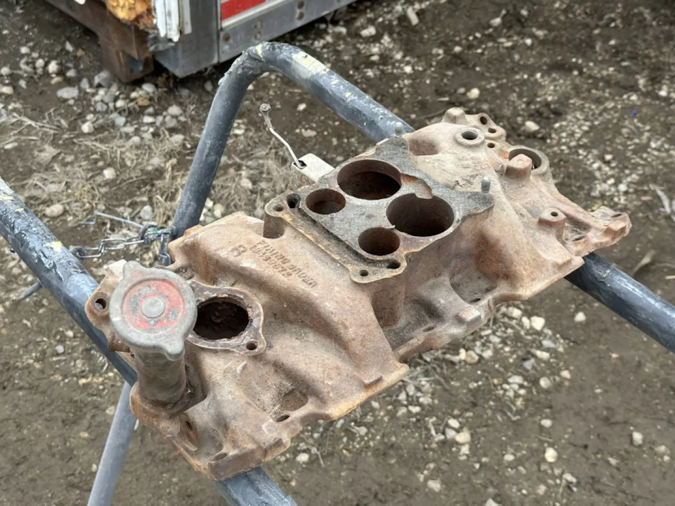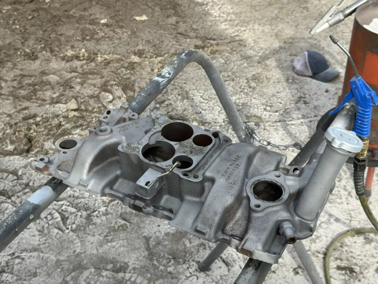 Двигатель покупал без плиты впуска, поэтому ставлю родной от старого двигателя. Впуск сразу под 4-камерный карбюратор, с автоподсосом и заливной горловиной масла — это как раз какой мне нравится. Быстрая проверка на трещины ничего не показала, поэтому тяжеленная железяка сразу попала под пескоструйку, грунт и окраску в тот же цвет что и двигатель. Автоподсос прикипел, поэтому решил красить сразу с ним. Не хотелось заморачиваться слишком сильно.