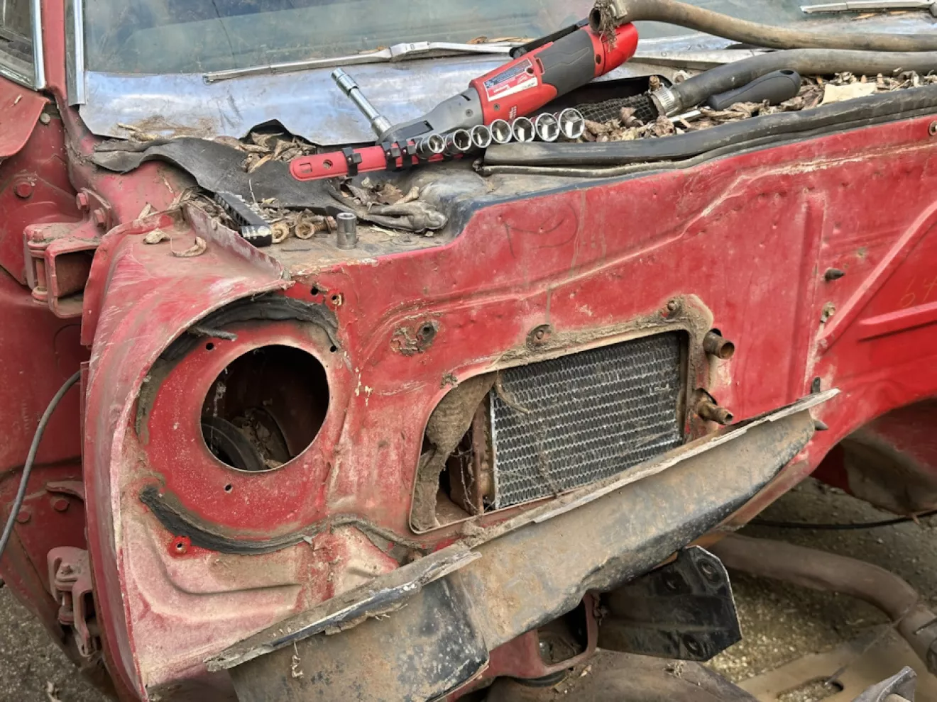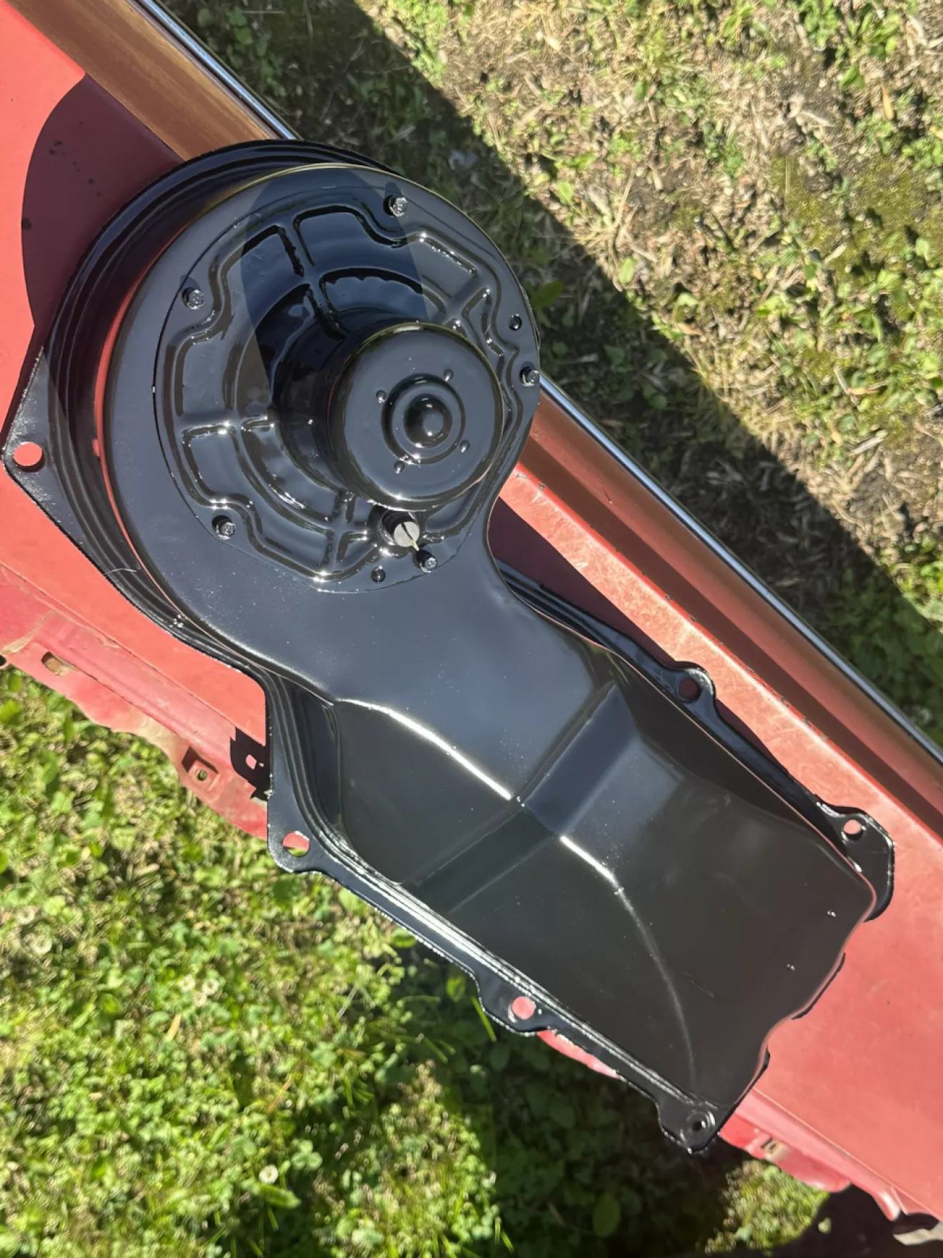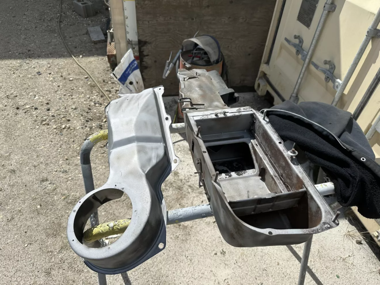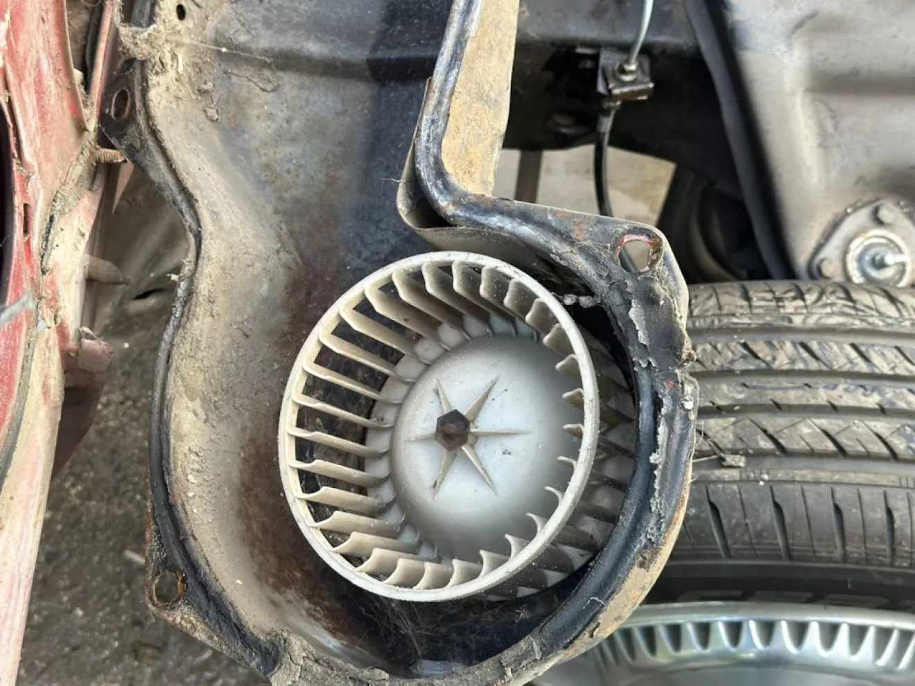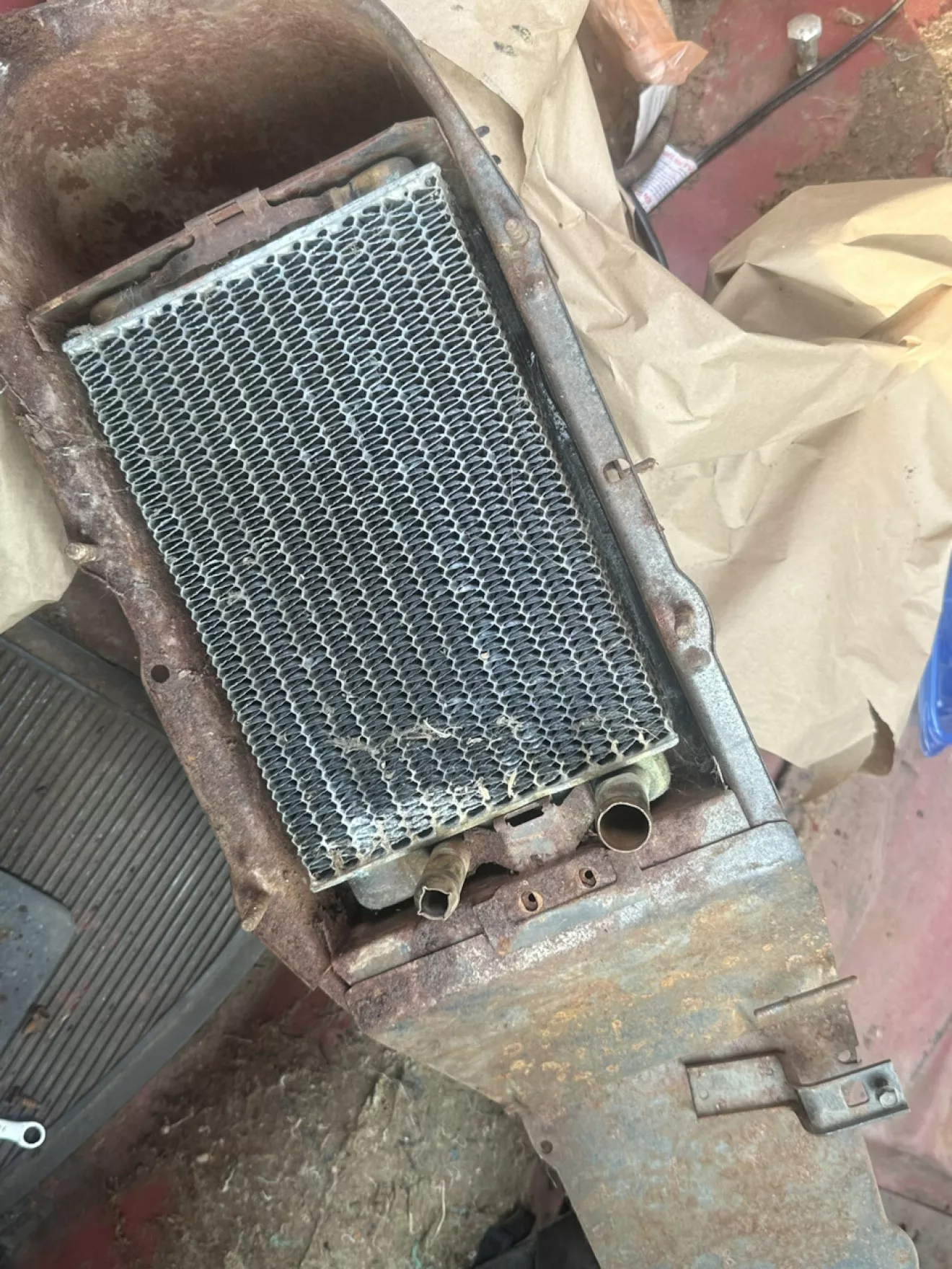 Печка стоит одновременно и удобно и неудобно. Проблема в том, что часть где расположен вентилятор спрятана за пассажирским подкрылком и его "укосиной", поэтому когда машина в сборе я думаю его замена не самая тривиальная работа. Я решил воспользоваться моментом и пока морды не было, располовинил корпус и отвез все на работу. Там я отпесочил его, моторчик — внутри было полно ржавчины, пыли а также всякой дряни принесенной мышами. Корпус затем в грунт, в черную краску. Корпус в полуглянец, моторчик в глянец — типа как с завода. При сборке также заменил старый радиатор, который на самом деле можно было и не трогать. Но я припас новый, заказанный с рокавто. Он типа более эффективный за счет мелких трубок и сот, но зато старый сделан как танк и уничтожить такой можно только 2-фунтовым молотком) но все-таки решил его отложить, а новый радиатор просто уплотнил получше и собрал все в корпус. Риторический вопрос — почему здесь бачки на радиаторе печки разнесены, а не сделаны в один с постоянно сгнивающей перегодкой.
