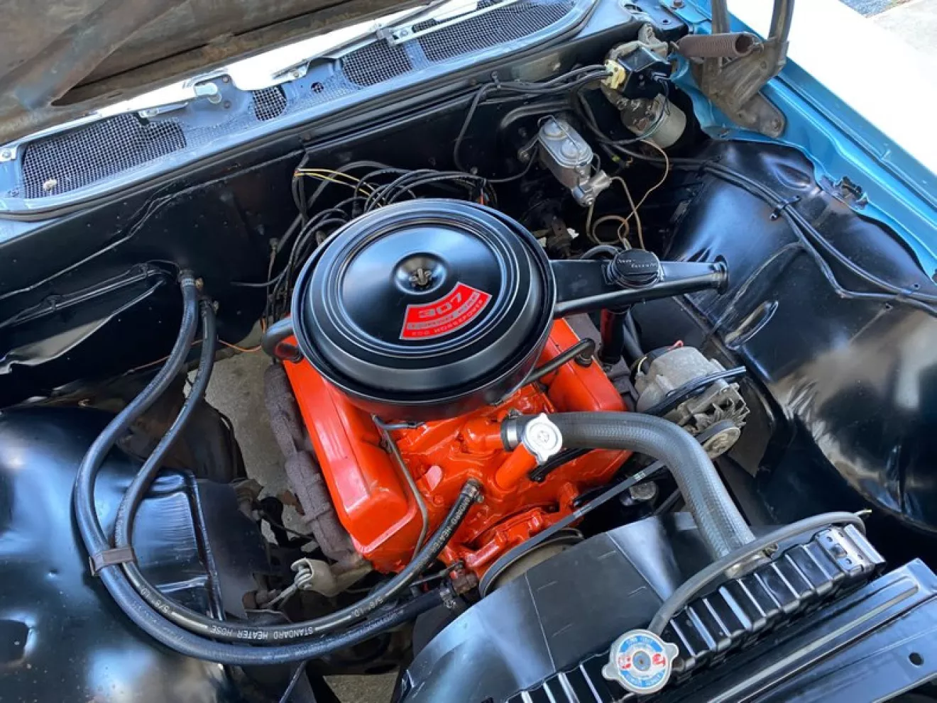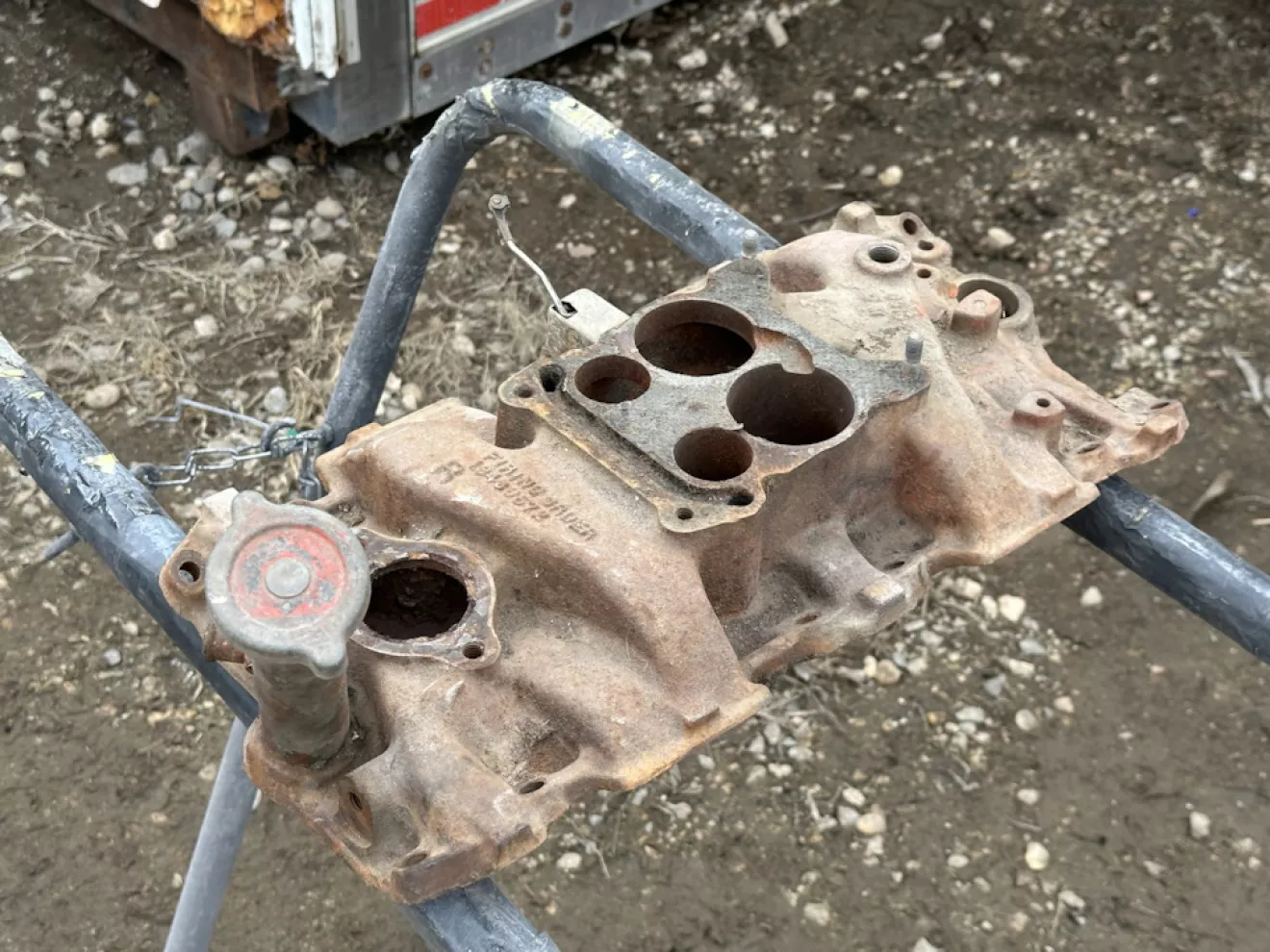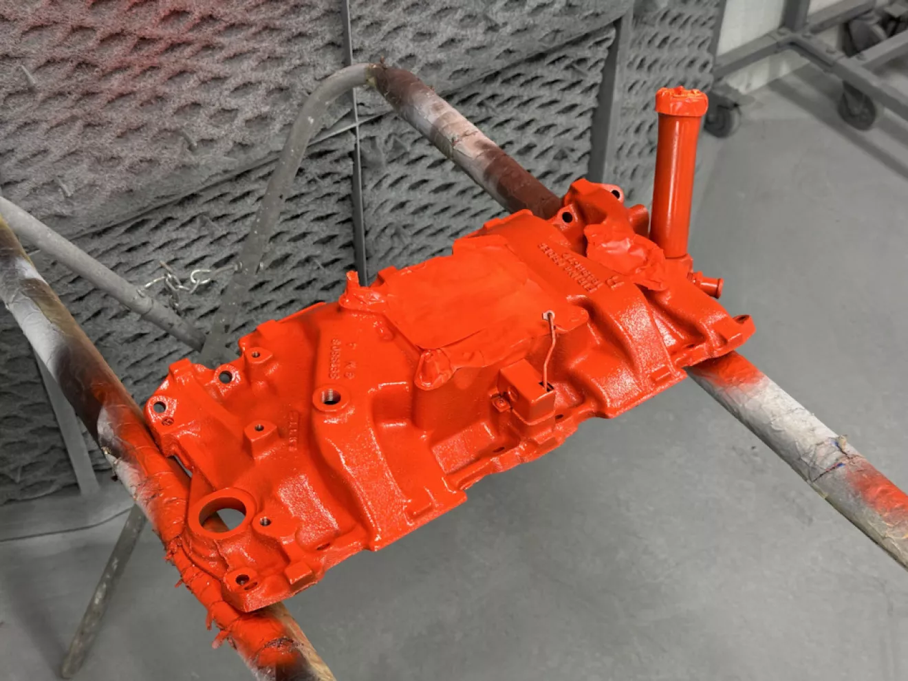 Мотор мне достался собранный, но не целиком — теперь надо доукомплектовать вещами вроде впуска, клапанных крышек и тд. Последние я зачемто отдал, ну да ладно (одна была помята). На работе под толстым слоем пыли стояла пескоструйка, получив согласие пошел сбил основную часть ржавчины и грязи и тут же покрасил. Краска — Duplicolor DE1620. Она типа специально для двигателей, на шеви идут два цвета — 1620 и 1608, последний более красный и им красили смоллблоки с 72-73 года и дальше. Я взял более оранжевый в который был покрашен стоковый 327. Краска покрывает слабо, нужно хотя бы 3 слоя чтобы выглядело хорошо — на весь мотор наверно потребуется 2,5-3 баллончика