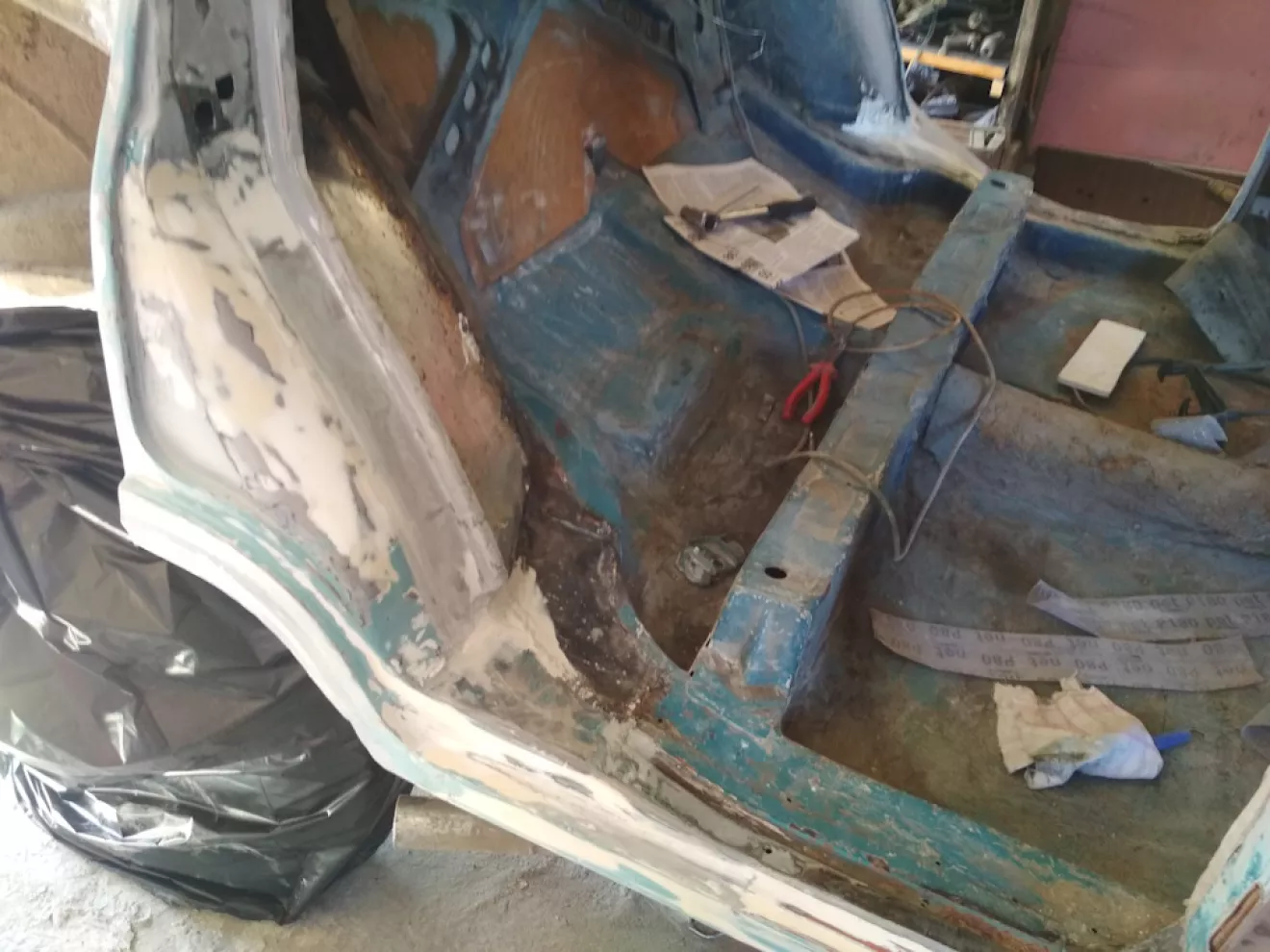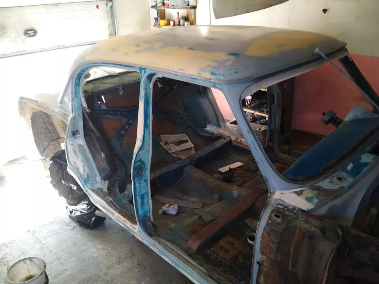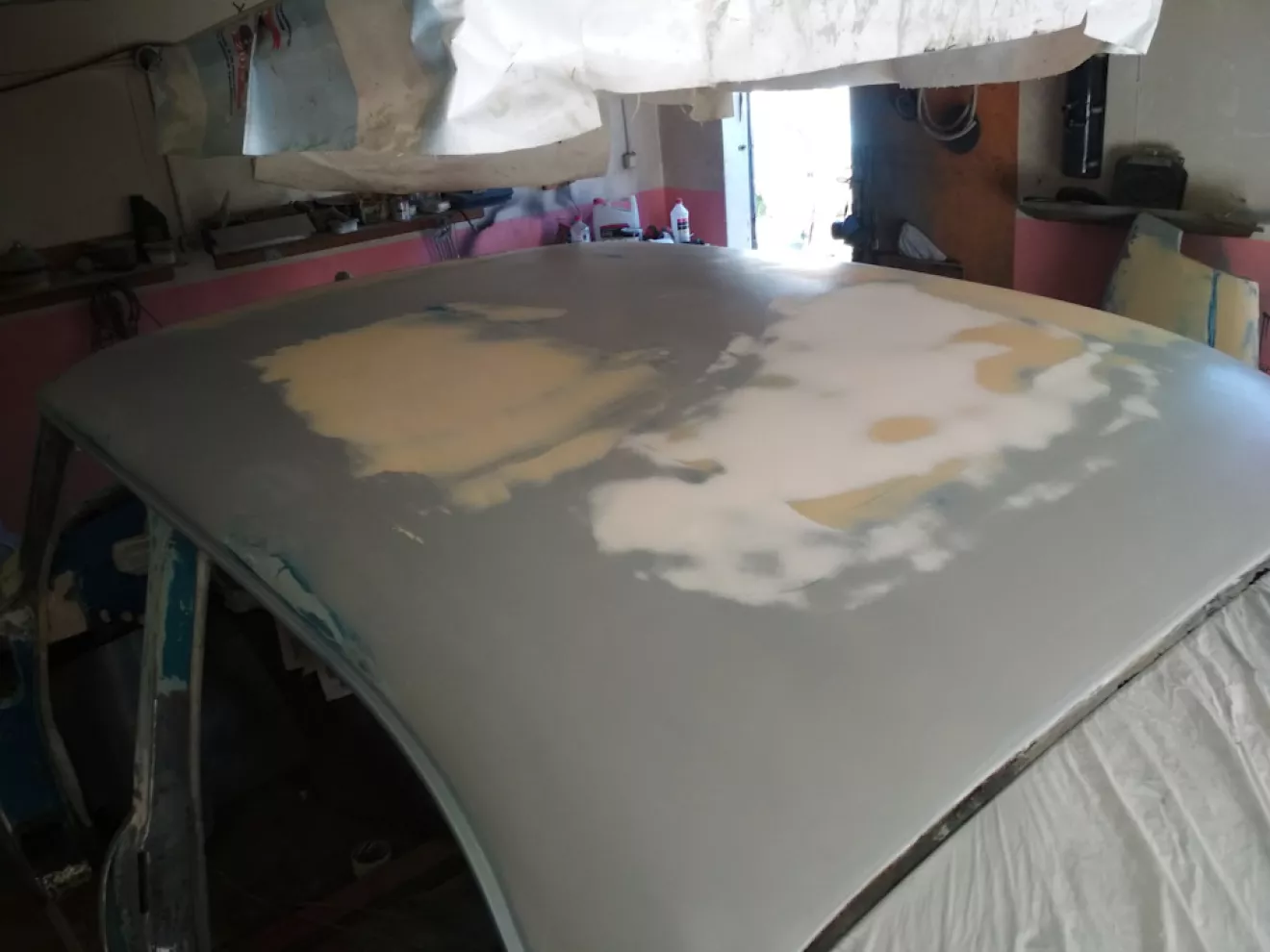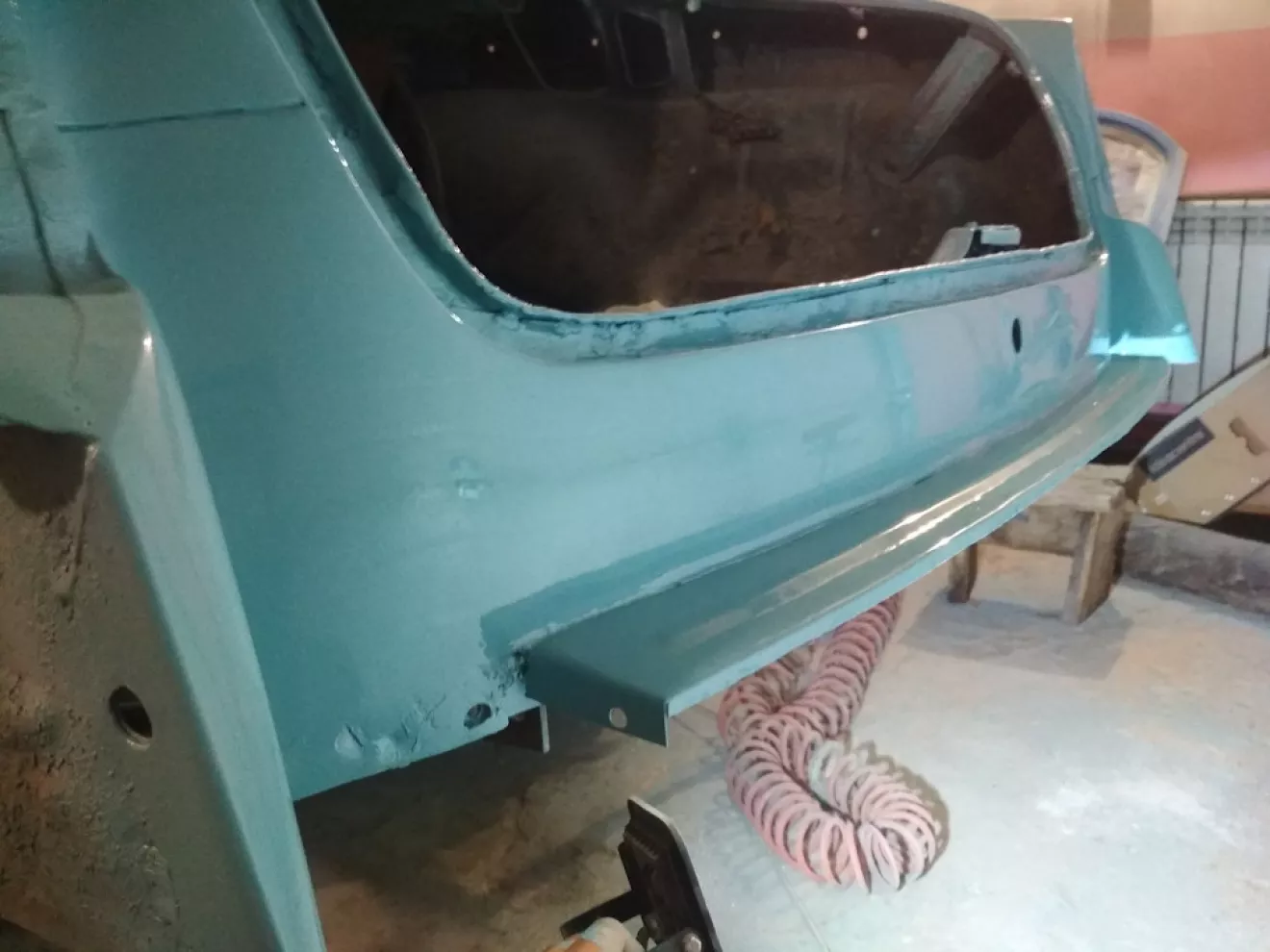 В апреле-месяце, когда я всё ещё варил железо, мы с хозяином машины договорились опробировать будущий цвет машины. Изначально планировался примерно заводской цвет кузова (темный оттенок морской волны) с белой крышей — но в реальности вышло светлее. В качестве основной краски был выбран цвет "Бриз" из палитры Vika акрил — правда смешивали его на подборе и разлили там же. Белая крыша тоже не чисто белая, а с желтоватым оттенком. Был вскоре открашен багажник, цвет понравился, и я приступил к рихтовке панелей.