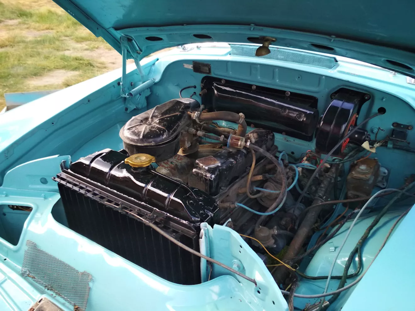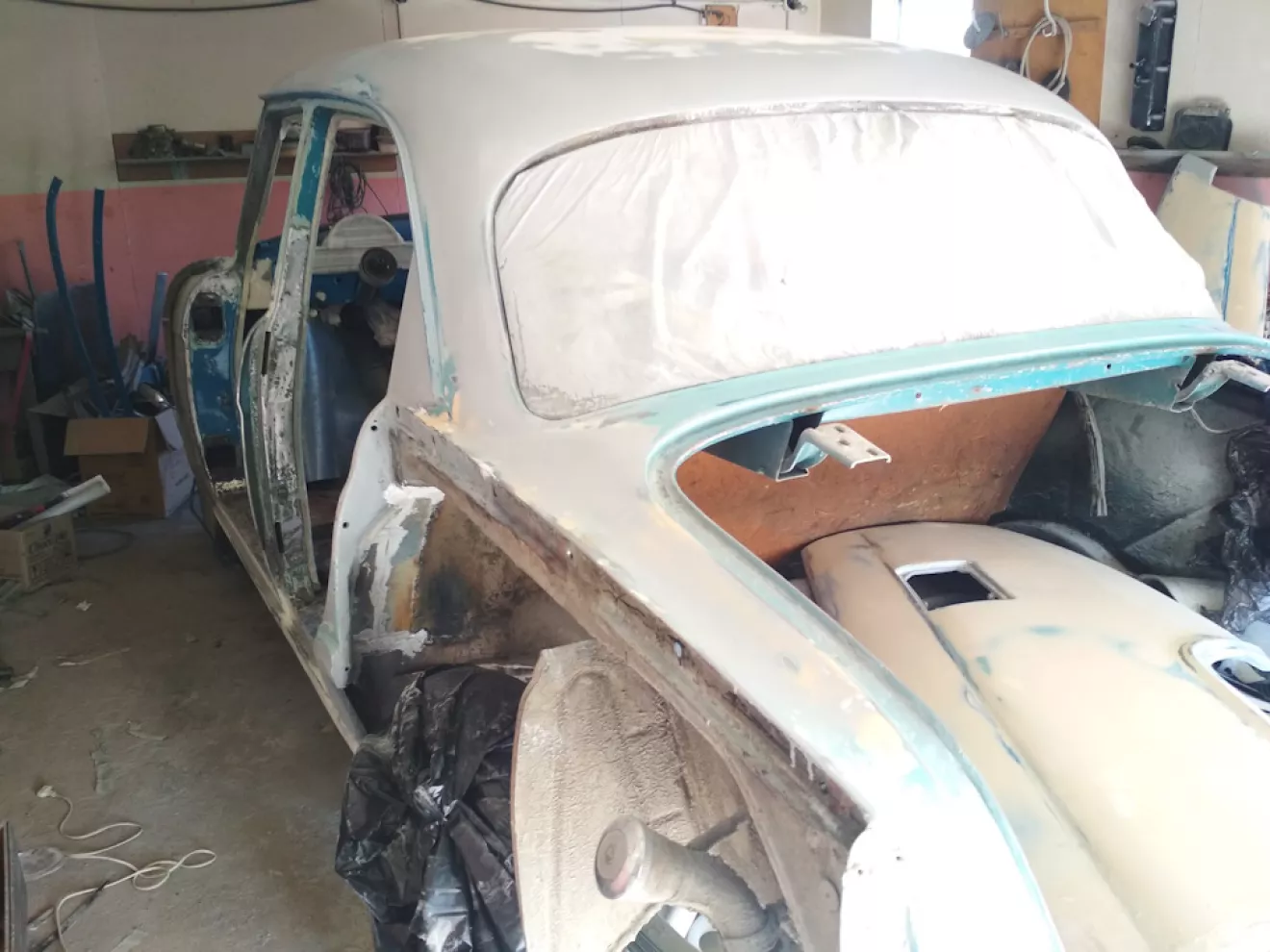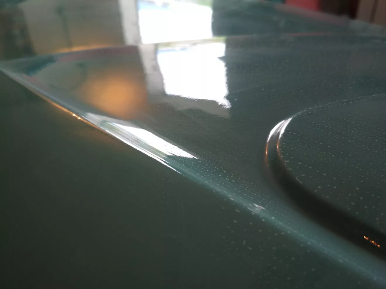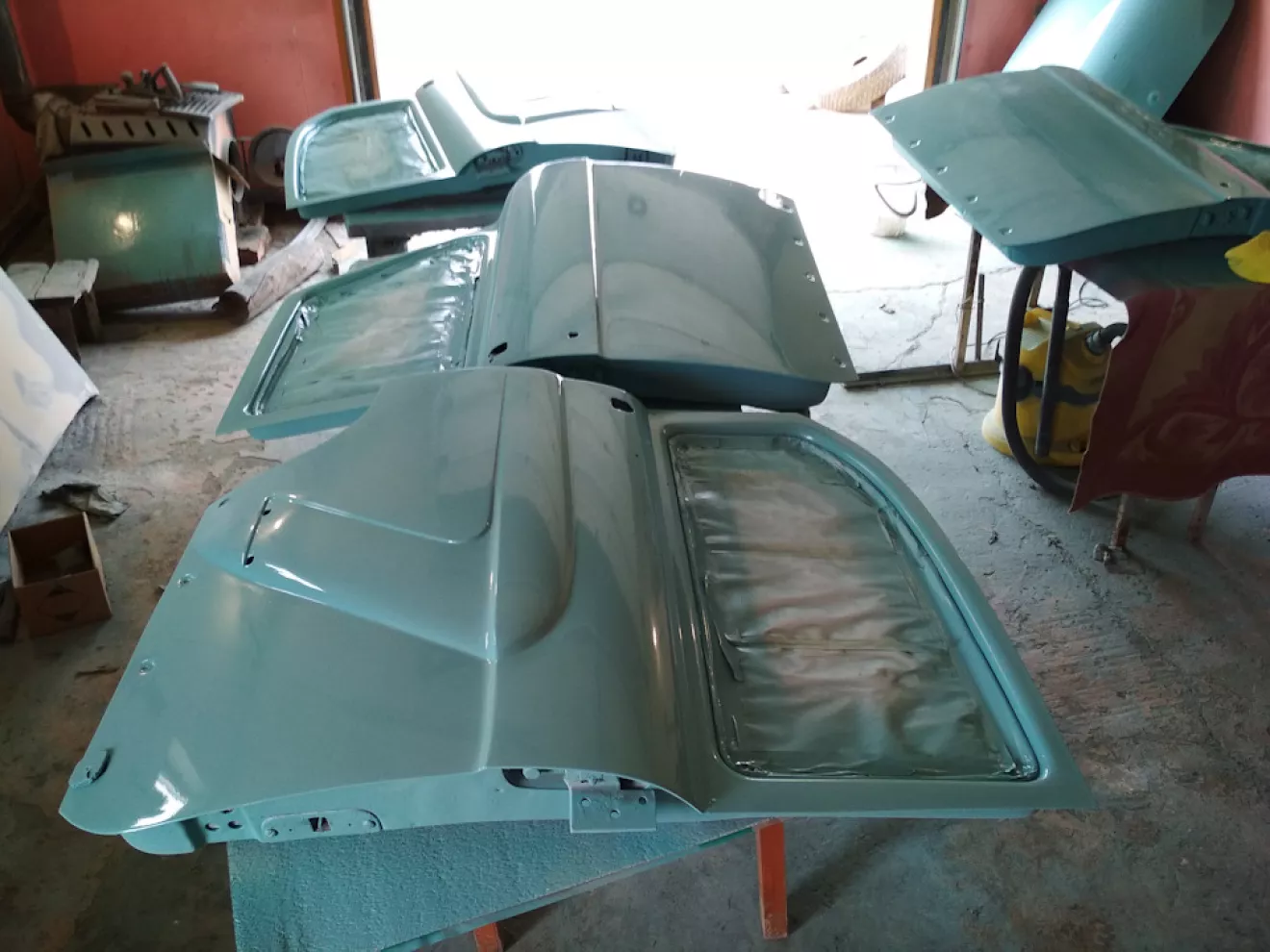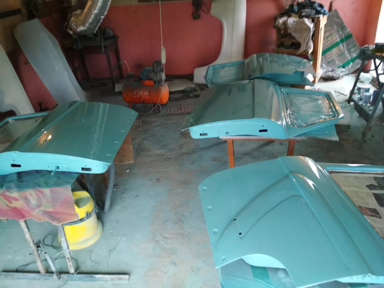 В апреле-месяце, когда я всё ещё варил железо, мы с хозяином машины договорились опробировать будущий цвет машины. Изначально планировался примерно заводской цвет кузова (темный оттенок морской волны) с белой крышей — но в реальности вышло светлее. В качестве основной краски был выбран цвет "Бриз" из палитры Vika акрил — правда смешивали его на подборе и разлили там же. Белая крыша тоже не чисто белая, а с желтоватым оттенком. Был вскоре открашен багажник, цвет понравился, и я приступил к рихтовке панелей.