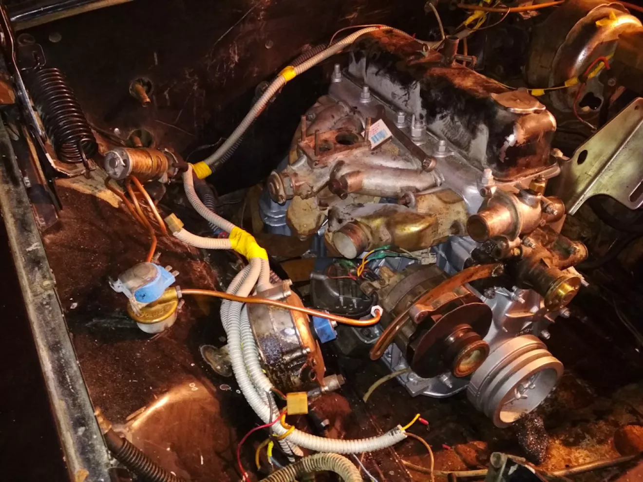 Сперва конечно хотел сделать все красиво — покрасил двигатель (на этот раз уже нормально), собрал кашу проводов и патрубков в более-менее организованные пучки и заварил старые трещины. Но на том пришлось остановиться, ибо поджимало время — и новый двигатель занял свое место.