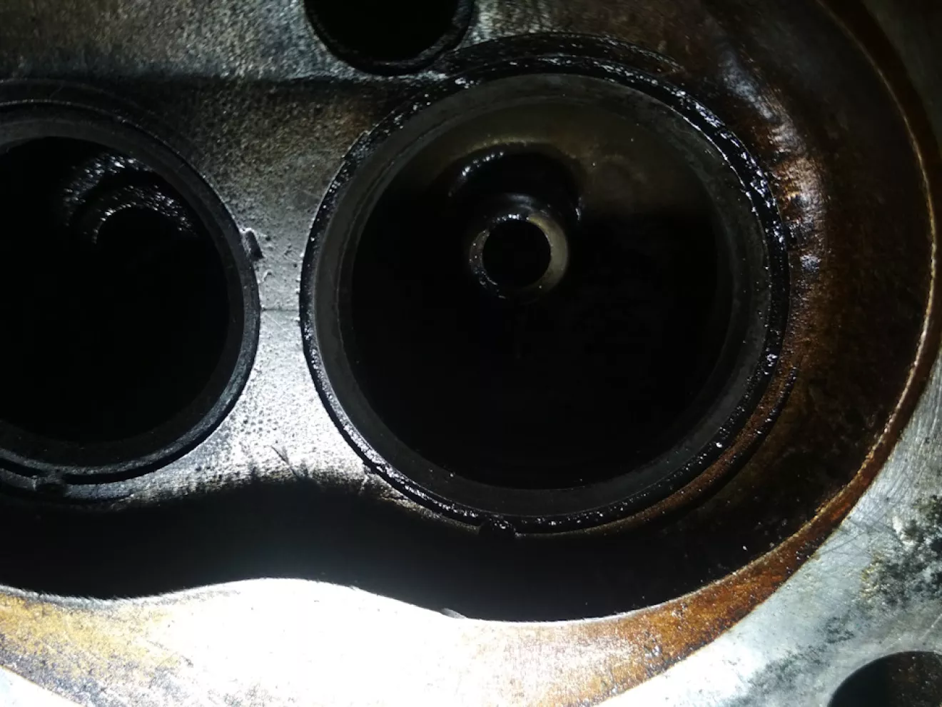 Вытащив мотор и наскоро разобрав верх, я принялся изучать головки. Ещё до разборки я пытался опрессовать каждый цилиндр при закрытых клапанах, но 6 очков давления трещину продуть не смогли — так что искал с тревогой, то ли ищу. Но вскоре все встало на свои места — на левой головке, в перемычке между клапанами 5 цилиндра, при протирке обнаружилась еле заметная полоска — это явно была трещина. Мотор до меня был практически сварен, на головках места креплений были продавлены, а шайбы гаек расплющены — скорее всего это и стало причиной трещины.