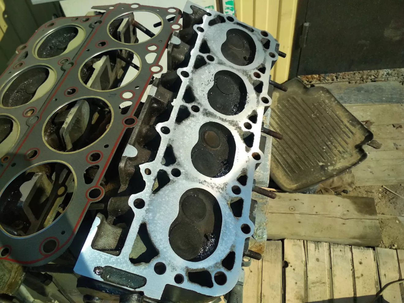 1). Головки у меня «промежуточные» — под ССж 7.0. Мотор до капиталки был точно перегрет, поэтому я сразу подумал на кривые плоскости. Как оказалось, плоскости и правда были не очень, но главная проблема оказалась в том, что кольца на прокладке ГБЦ продавили свои посадочные места в самой головке! Изза этого, в левой головке эти колечки были грязные и темные – а на правой – блестящие. «Продувало» в итоге по всей площади. Цилиндры на вид еще живые, с хоном – несмотря на перегревы. Почему-то почти все клапаны, особенно впускные, были в мелких кратерах. При капиталке, головки я не трогал, вот и поплатился – в итоге почти все клапаны были заменены.