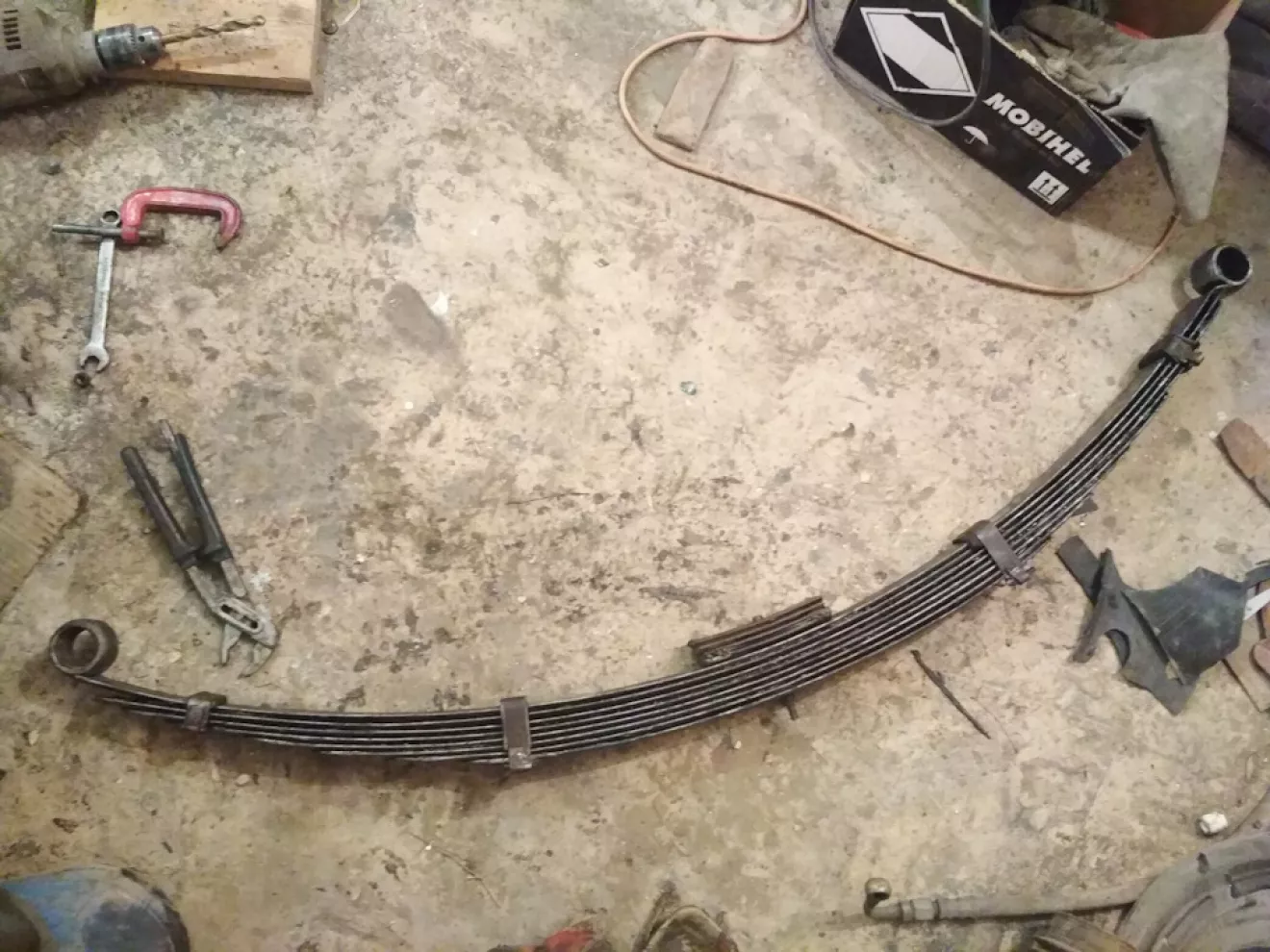 Мост, как оказалось, живой и не орет, просто был слегка подразобран. Попутно его установке решил навести порядок в рессорах. У меня было 5 рессор в наличии — всех их разобрал, подобрал листы с одинаковым эллипсом, почистил до металла, покрасил и собрал на графитке. Никогда на своей машине не уделял столько внимания рессорам) листов сделал меньше чем с завода и добавил импровизированные проставки из распиленных листов. Осталось только обмотать рессоры во что-то прочное, поверх пищевой пленки.