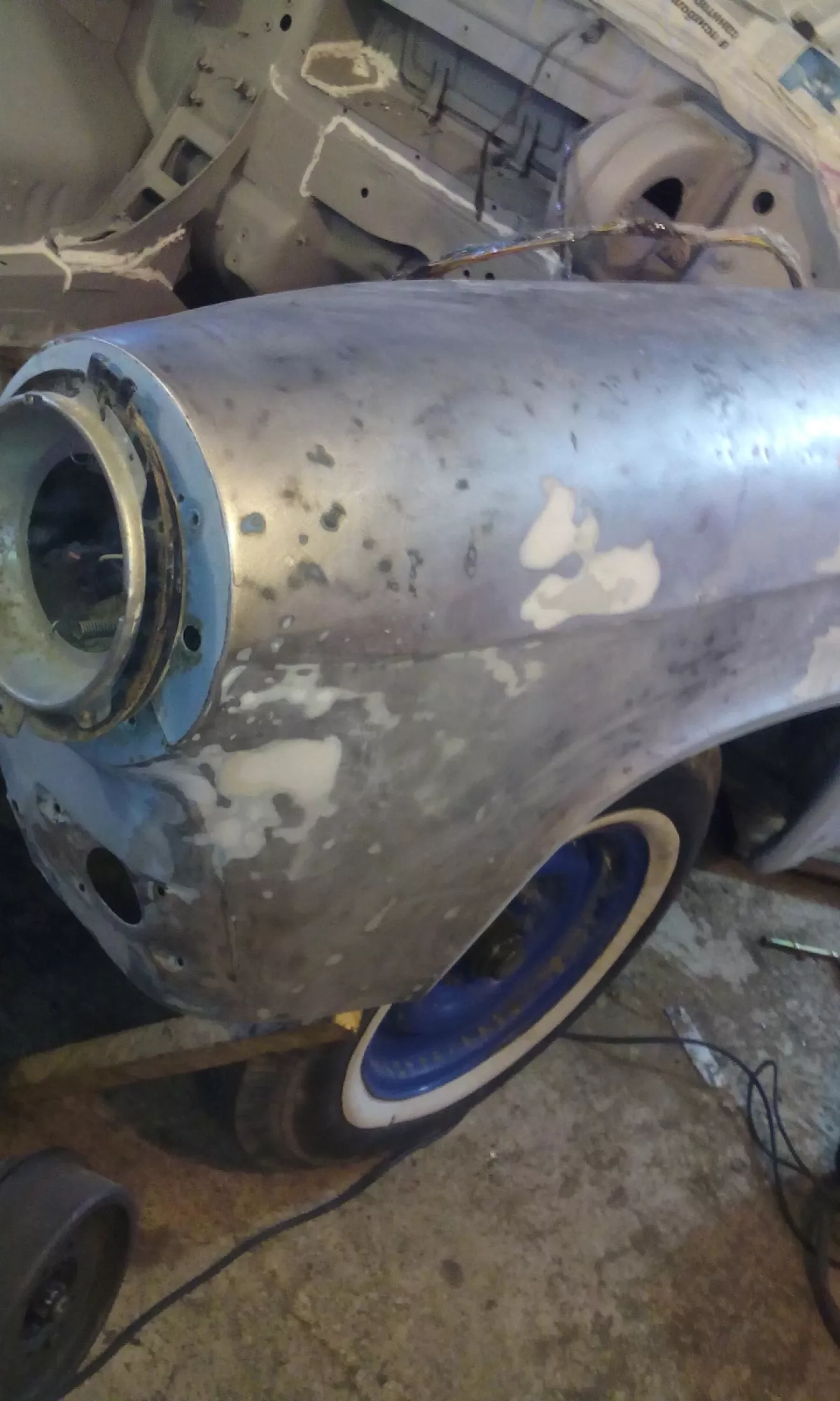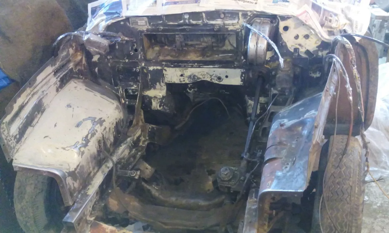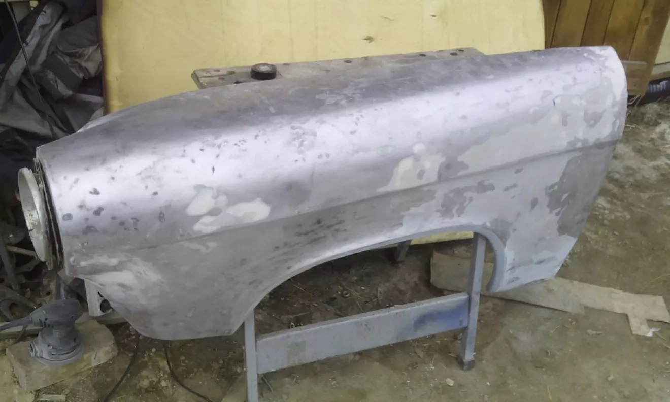 Параллельно занимался рихтовкой обожженных панелей. Вначале хотел просто зашкурить да задуть, но что-то в голове щелкнуло и понеслась) крыло было очень сильно пожеванным, многократно ремонтированным до этого. оно рвалось, верх был продавлен так, что выпуклая форма пропала, а во вмятинах стояла дождевая вода. Когда красился в 2012 году, я слегка рихтанул и тупо замазал все это шпаклей. хоть она и не отлетела, такой подход мне больше не нужен — поэтому верх крыла был отчеканен, а кромку со стороны водительской двери пришлось и вовсе срезать.