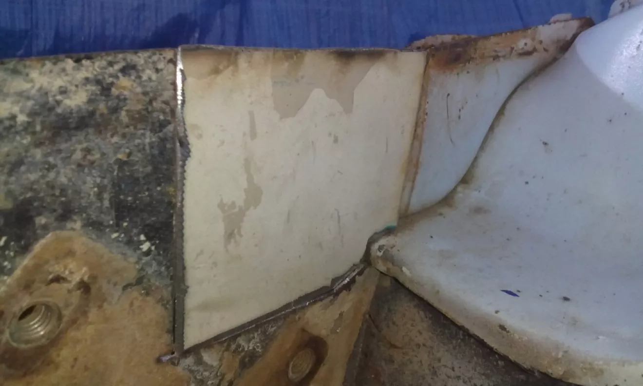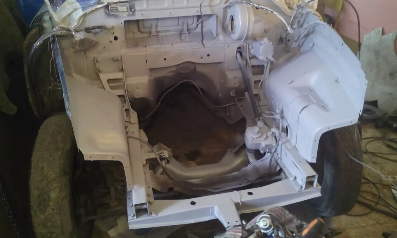 Постарался пролезть во все скрытые места, но было тяжко по левому борту — тормозные трубки намертво прикисли, отчасти они помешали нормально зашкурить под ними, ну и по мелочевке. Нашел старую трещину на стенке моторного отсека, она была сразу же заварена. Также заварил 6 очагов ижанита в разных местах. К сожалению не смог снять улитку, пришлось дуть вместе с ней) очень хитроумный крепеж, если провернулся — пиши пропало. как подсохло, замазал швы герметосом. завтра дуну еще раз, уже обычным грунтом, далее подкапотка будет окрашена в черный цвет.