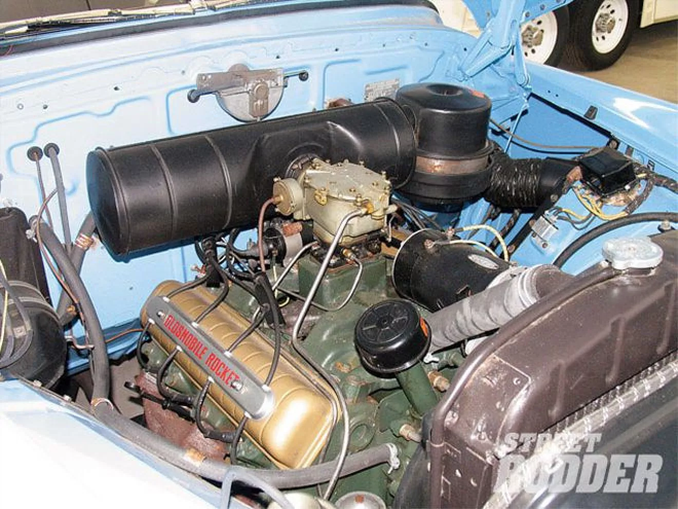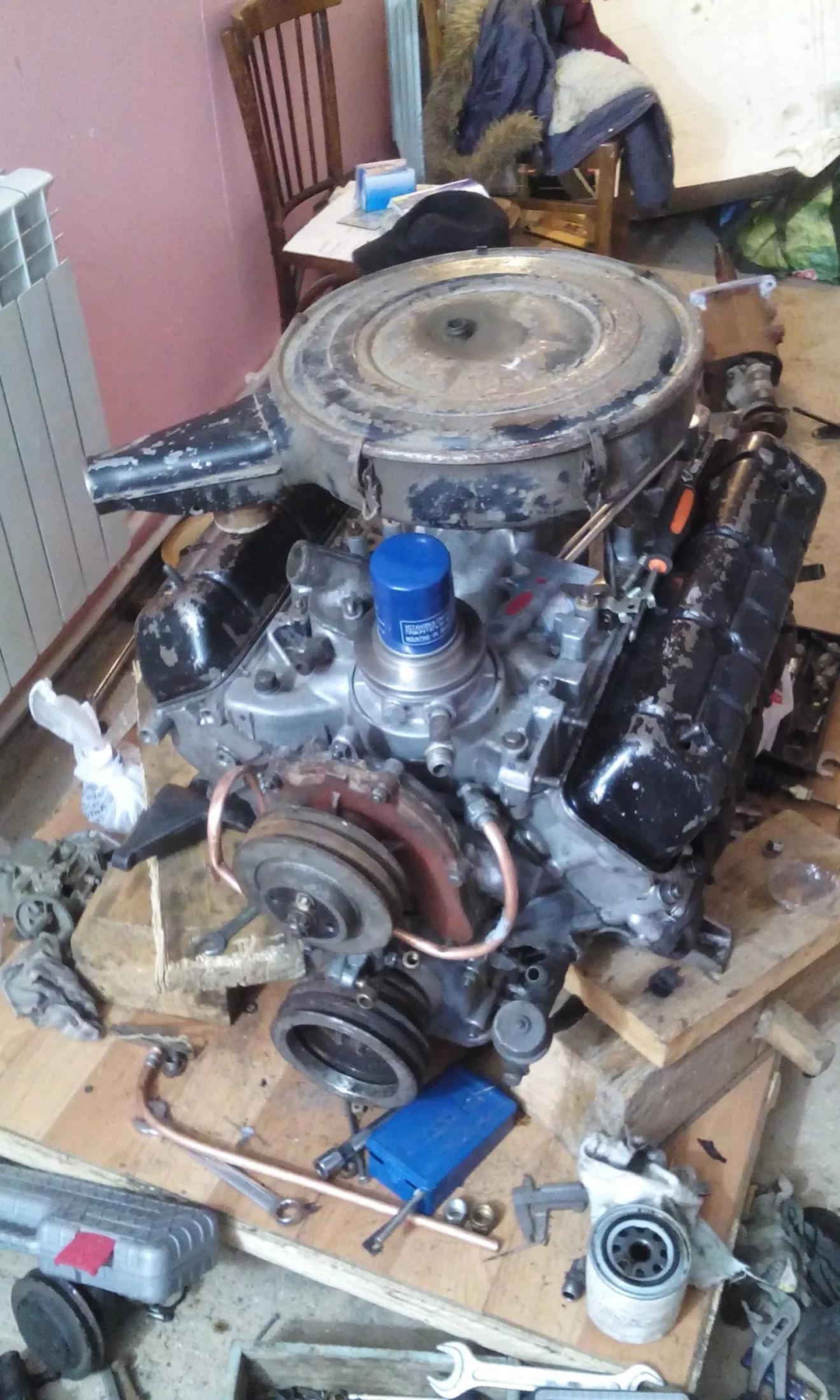 Обычно V8 при свапе окрашивают в классические ви-эйт цвета: синий от ФоМоКо, красный от Шеви, оранжевый Мопар, а то и вообще в дикие кислотно-зеленые цвета)