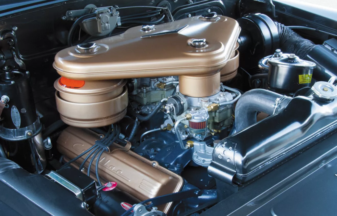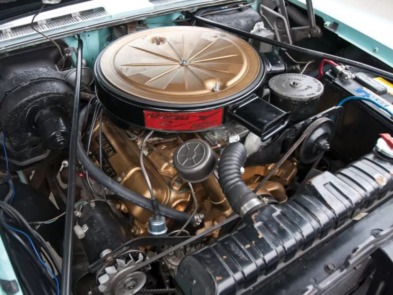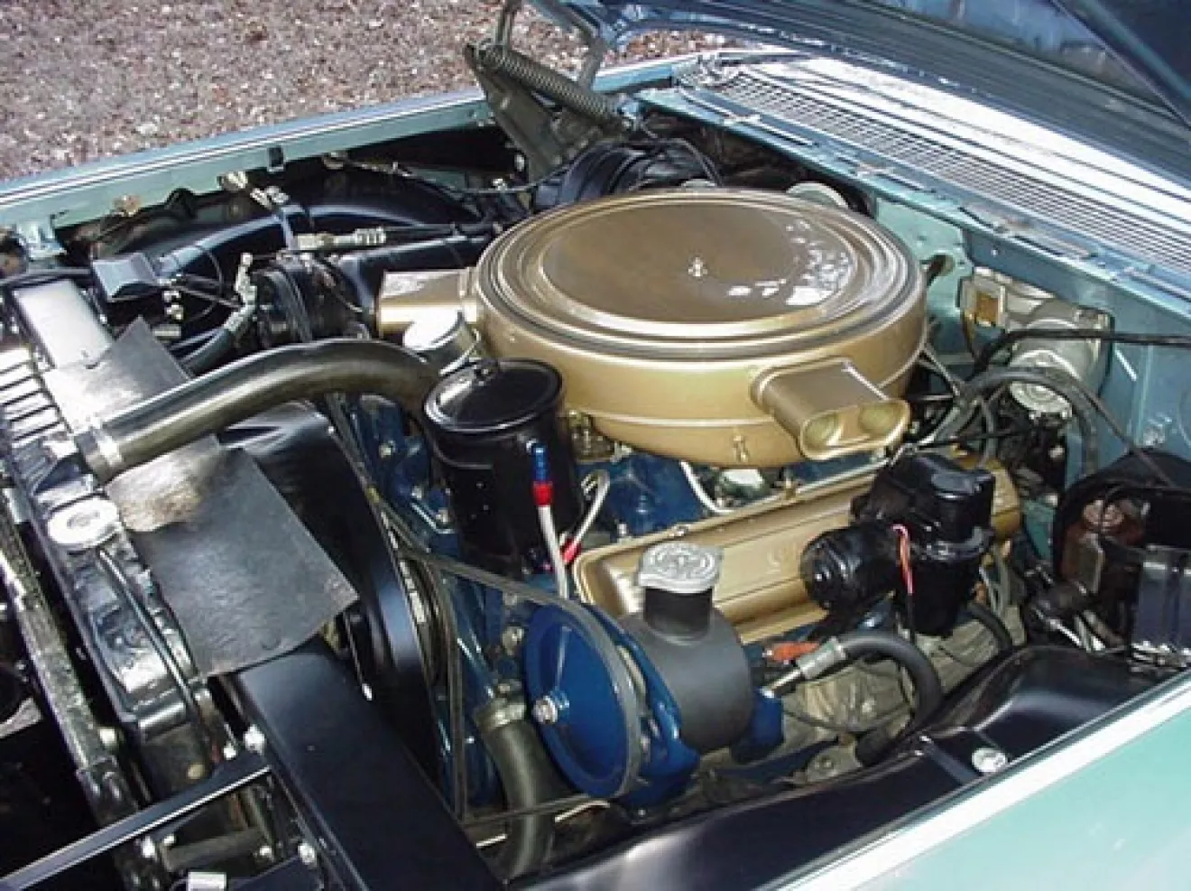 я решил немного соригинальничать, ну и воздать собсно почести моим любимым ранним V8 — пионерам верхних клапанов :) среди них до начала 60ых была популярна окраска в зеленый или темно-синий цвет, притом воздушный фильтр и иногда клапанные крышки красились в "золотую пыль".