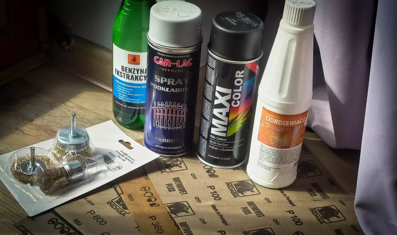 Тому закуплено знежирювач, перетворювач іржі, грунт та матова чорна фарба.. Наждачки трохи. 😁