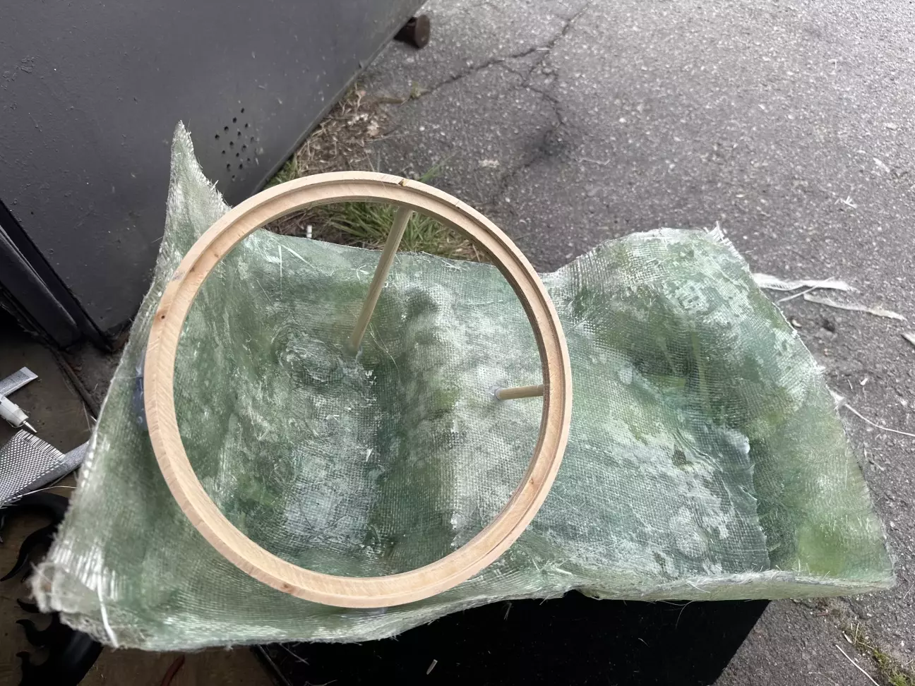 Купил кольцо под саб, выставил его под нужным углом, чтобы динамик смотрел как надо. Закрепил всё это дело и начал стягивать форму тканью, чтобы задать объём будущего короба.