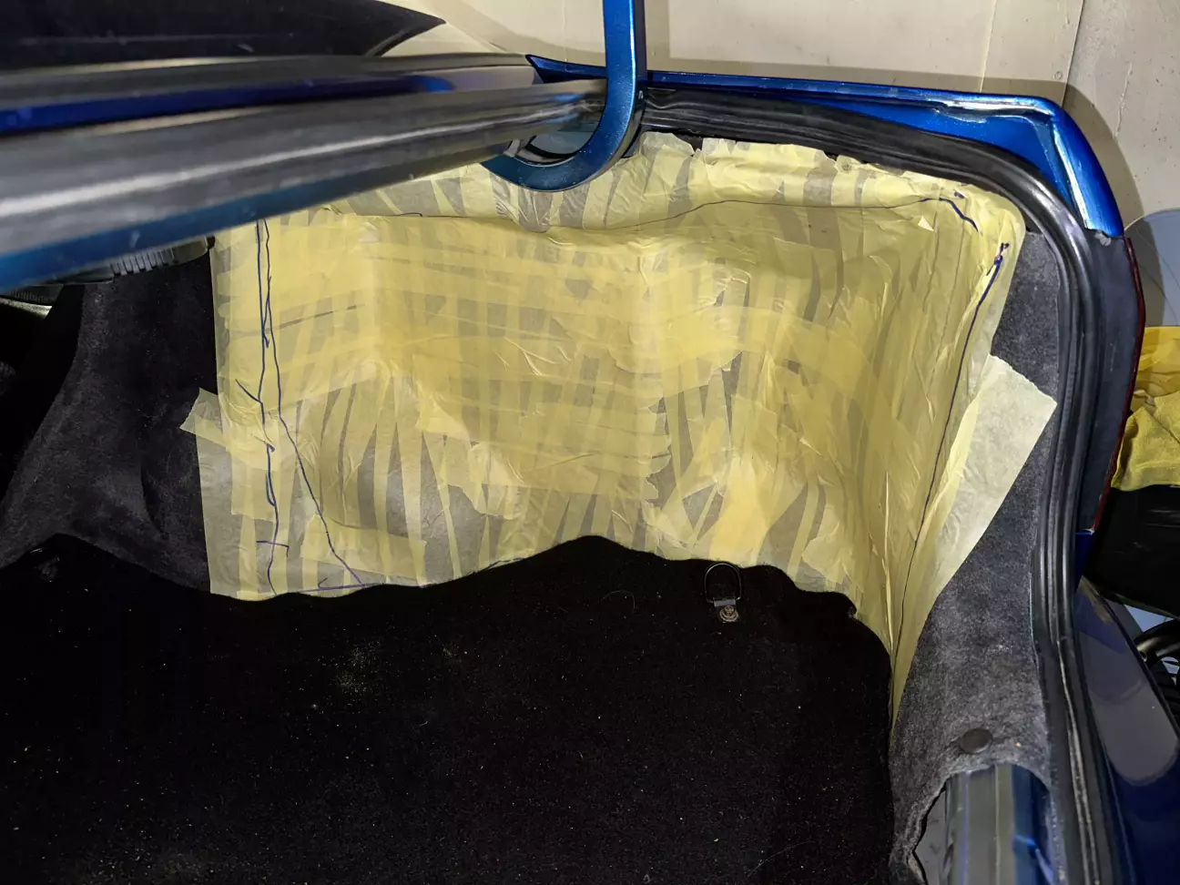 Полностью освободил багажник, всё вычистил. Место, где будет короб, заклеил малярным скотчем в несколько слоёв, чтобы потом не оторвать всё это вместе с кузовом 😄 Сверху прошёлся плёнкой — это как разделительный слой.