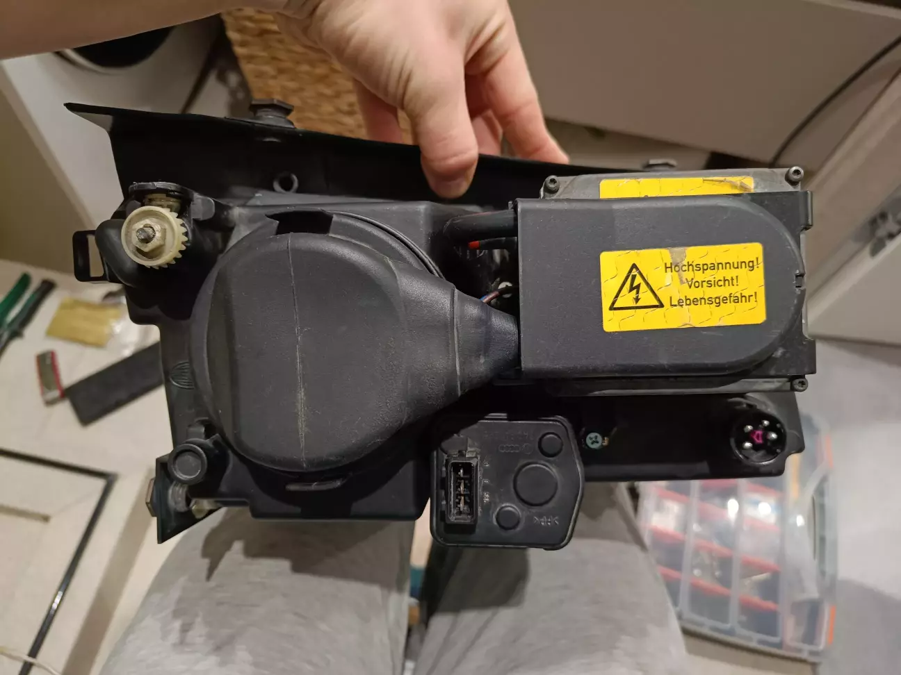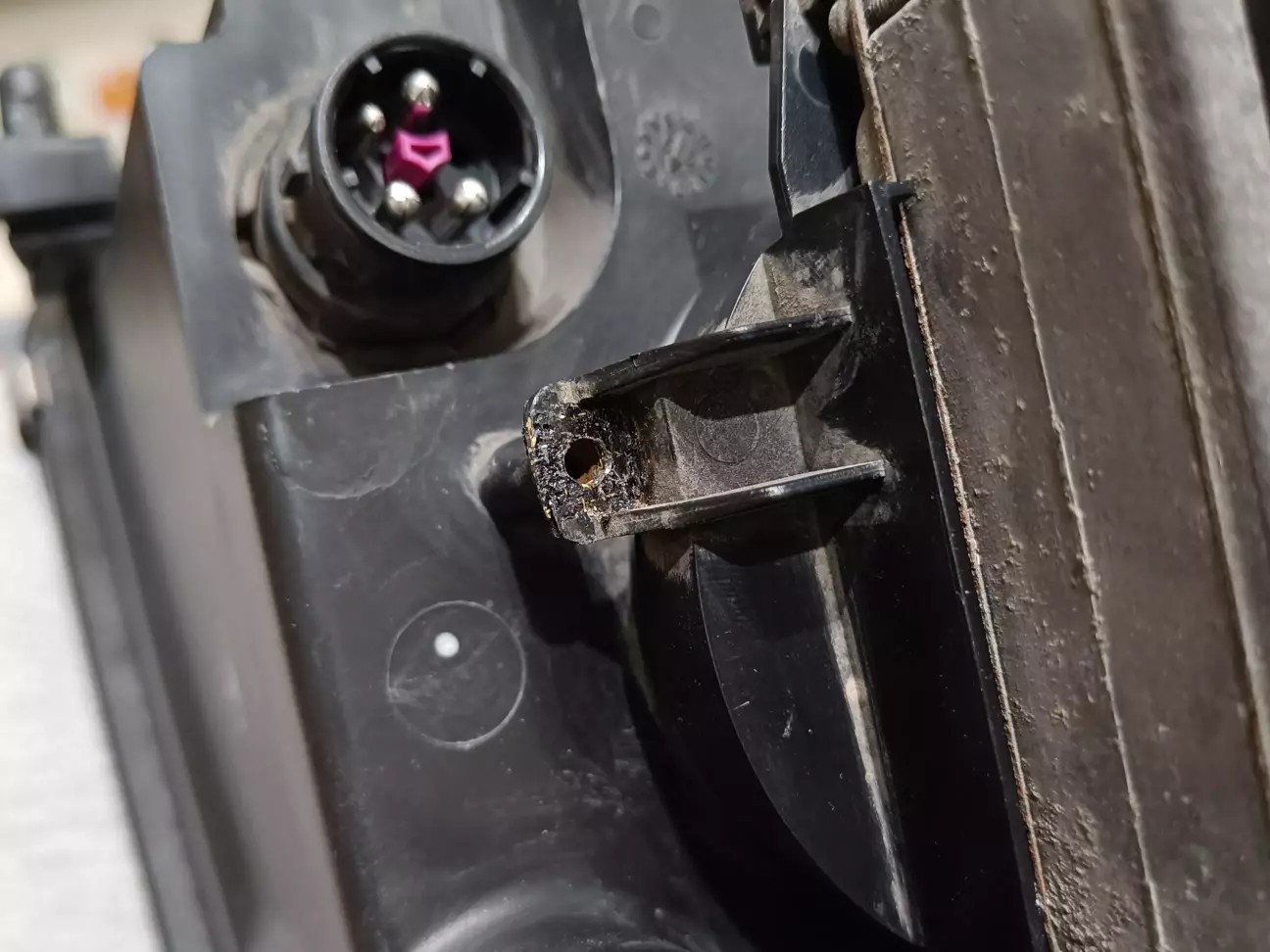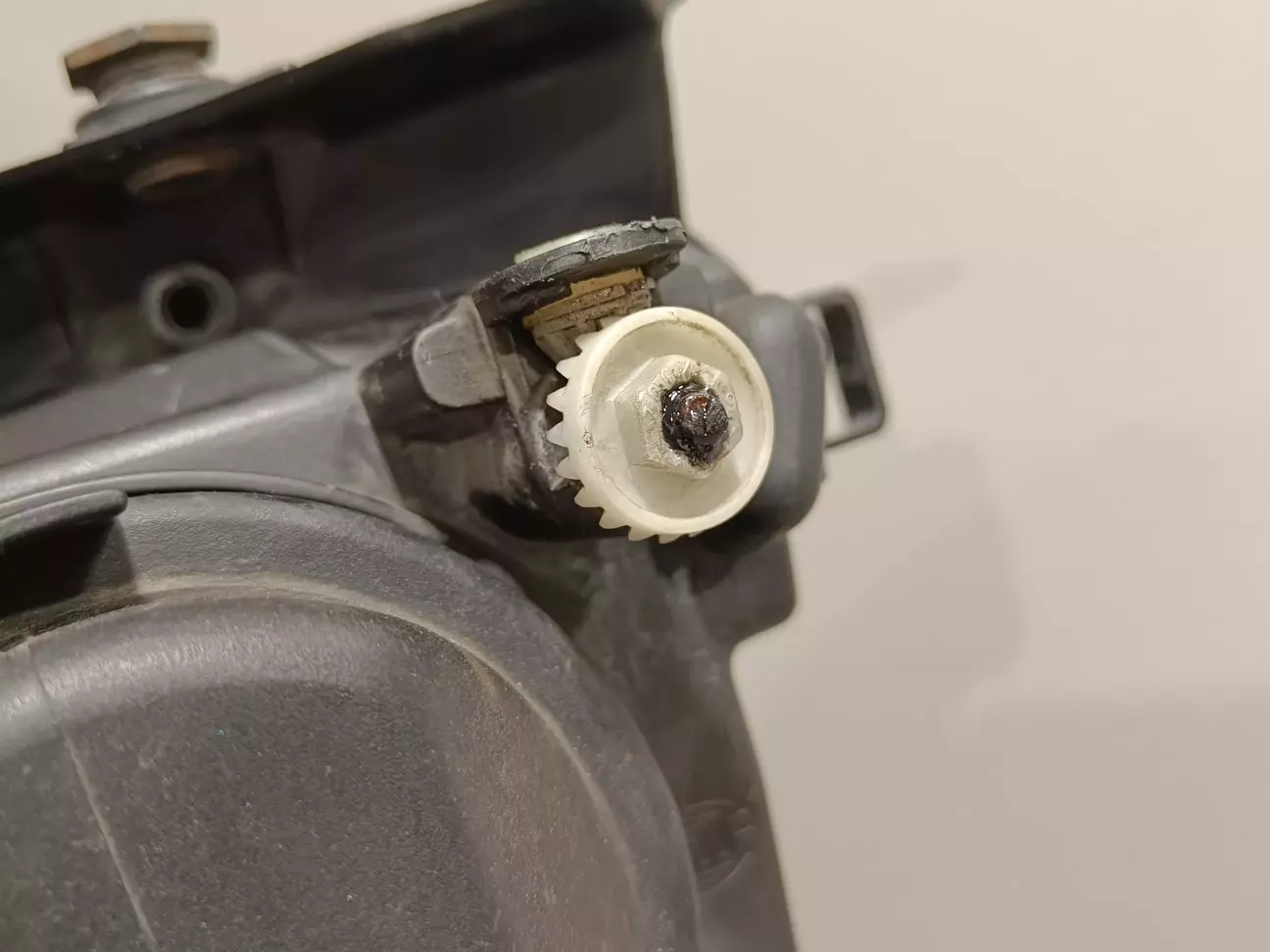 Під час первинного налаштуванні фари, відвалилася налаштувальна шестерня. Ремонтував 2K поліуретановою смолою, попередньо зробивши насічки на валу і насвердливши трошки дірок всередині шестерні, щоб запобігти провертанню шестерні під навантаженням. Не варто сушити феном смолу: вона від температури стає лише м'якшою!!!