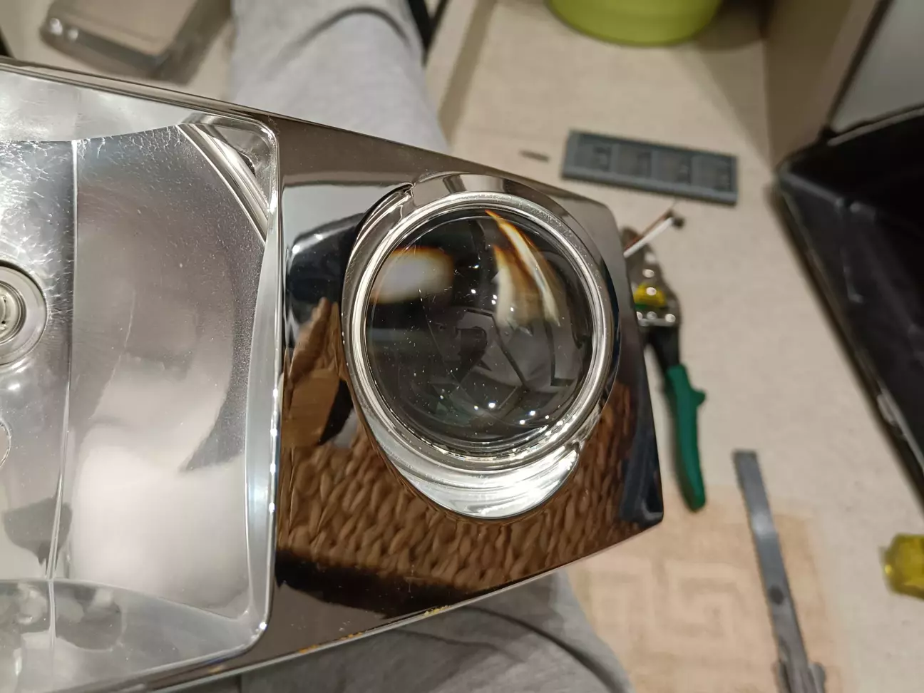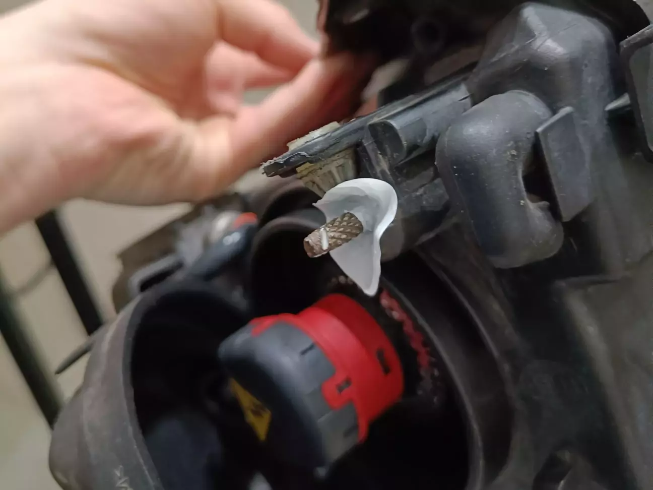 Особливо ювелірна робота полягала у збільшенні отвору в масці для більшої лінзи, а також у видаленні зайвого масиву пластику на опорній ніжці для правильного розміщення корпусу нової лінзи. Також на обох фарах довелося відрізати зайві міліметри металу на штатному кронштейні кріплення лінзи, щоби нова лінза встала рівненько. Для цих ювелірних робіт маю гравер з багатим набором оснащення)