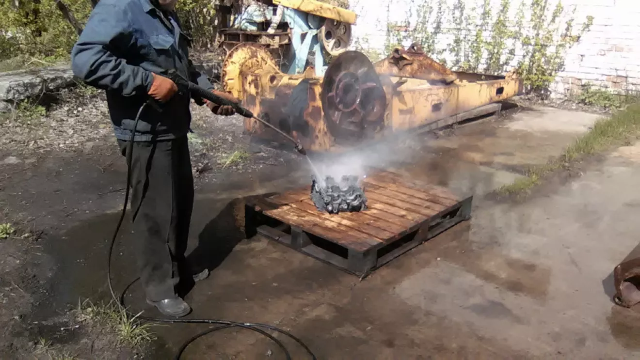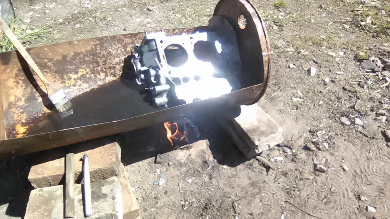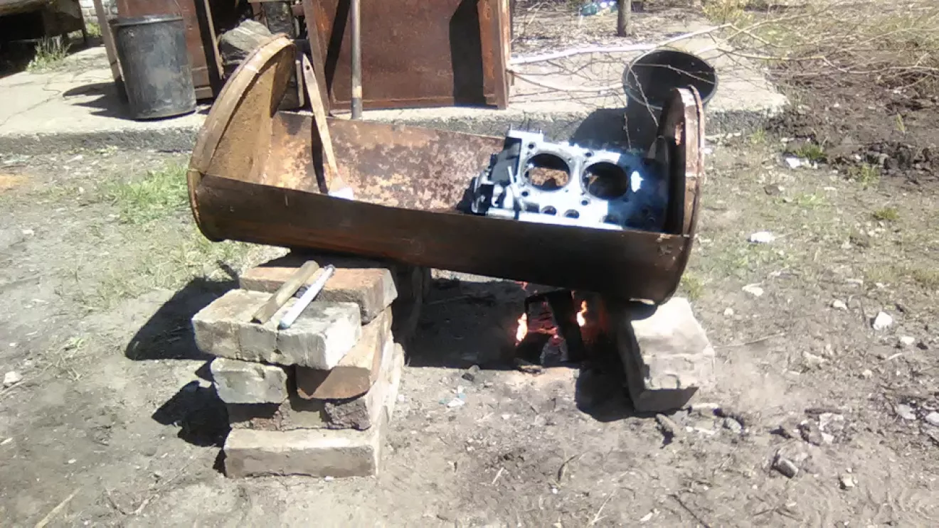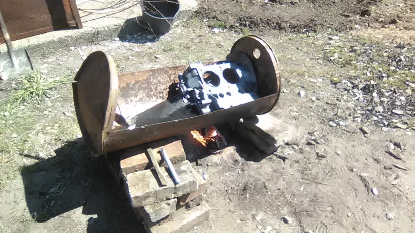 С чего начать ? Наверное с мотора… Тогда достаём бочку и режем пополам . В получившееся корыто наливаем саляру и разводим кастёрчик маленький . Когда ДТ прогрелось, погружаем туда блок . В руки кисточки, ёршики, щётки и тряпочку, деревянный шкребок . Всё обильно замачиваем, нагреваем и трём-трём-трём . В конце стирки вытащив из ванны тёплый блок (половинку в нашем случае) наносим химию купленную у представителя *Kranzle*, ждём десять минут и смываем мойкой ВД