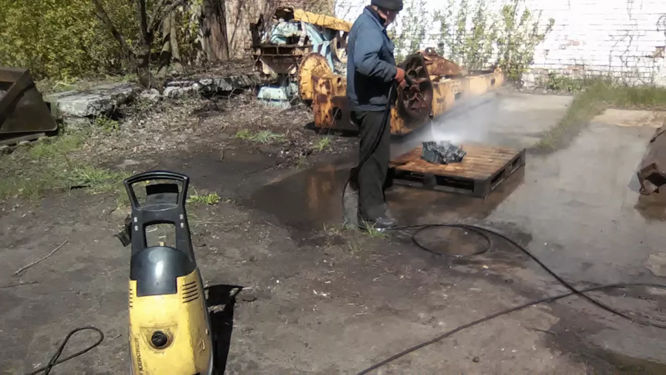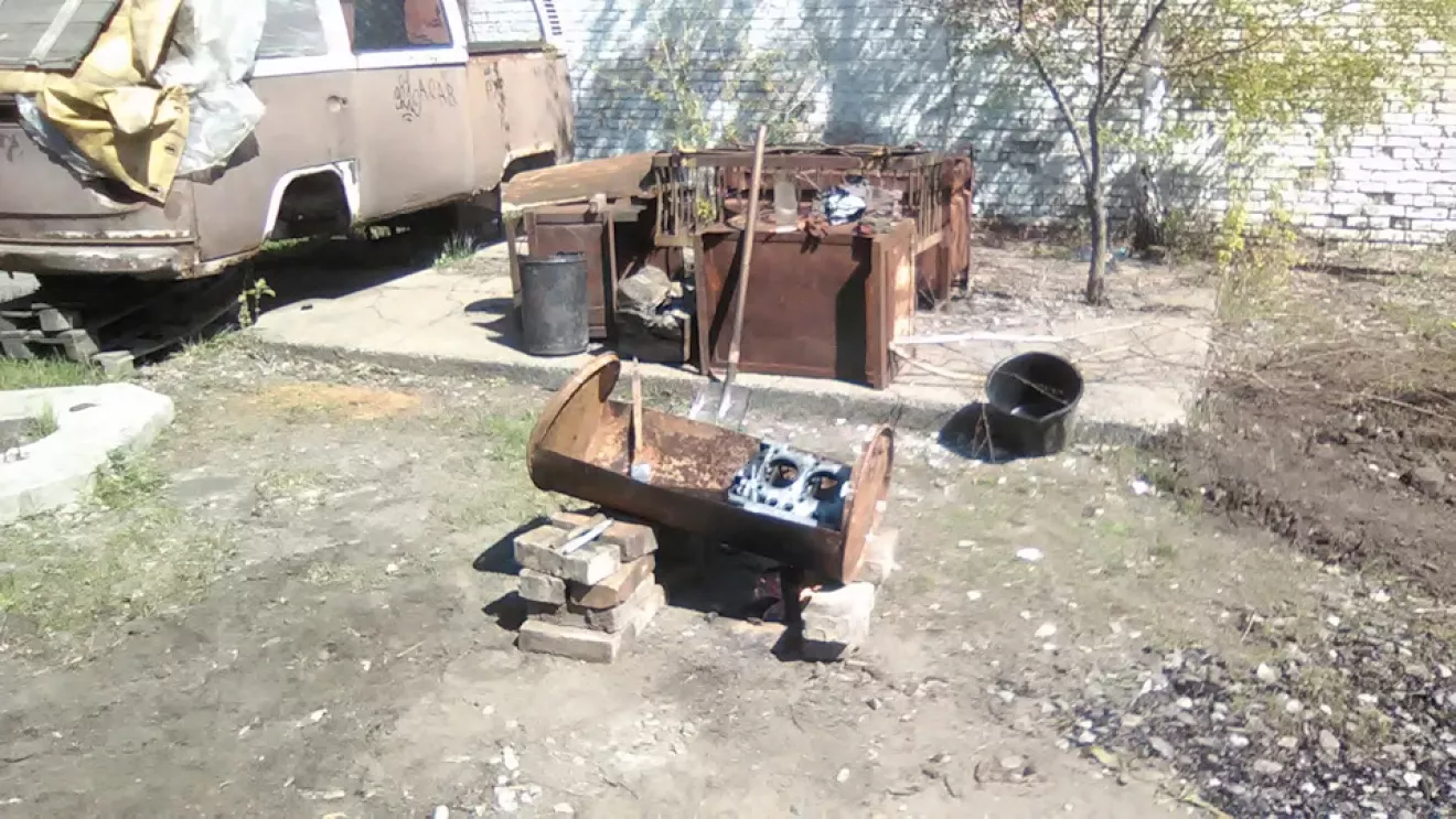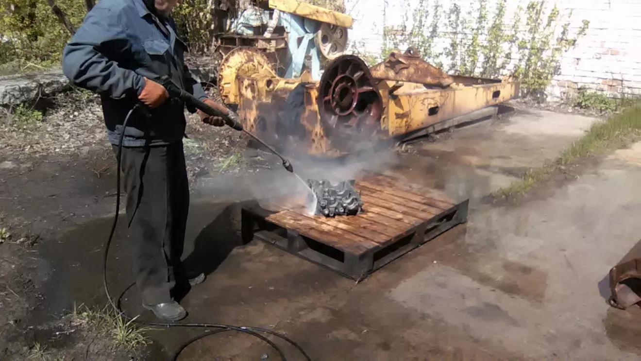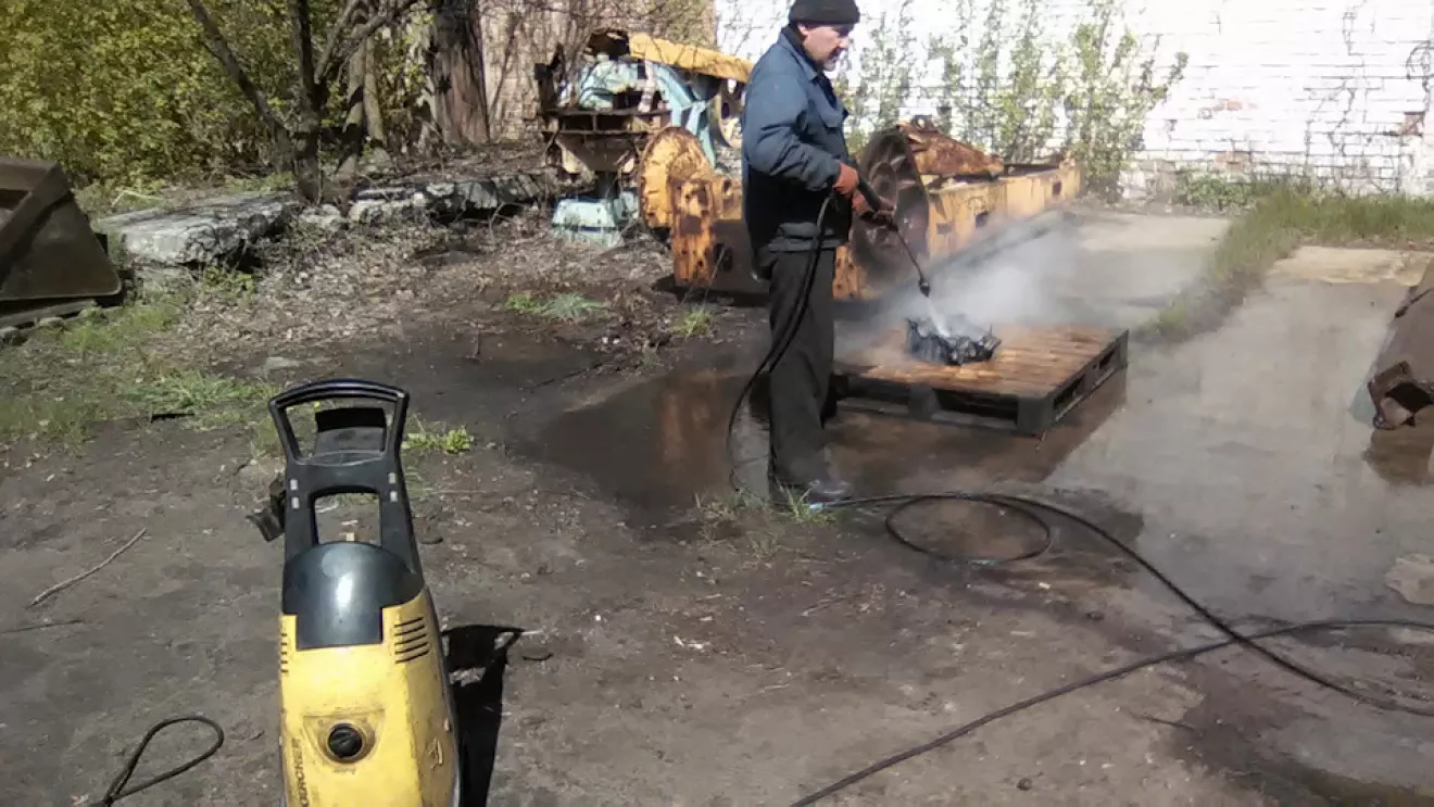 С чего начать ? Наверное с мотора… Тогда достаём бочку и режем пополам . В получившееся корыто наливаем саляру и разводим кастёрчик маленький . Когда ДТ прогрелось, погружаем туда блок . В руки кисточки, ёршики, щётки и тряпочку, деревянный шкребок . Всё обильно замачиваем, нагреваем и трём-трём-трём . В конце стирки вытащив из ванны тёплый блок (половинку в нашем случае) наносим химию купленную у представителя *Kranzle*, ждём десять минут и смываем мойкой ВД