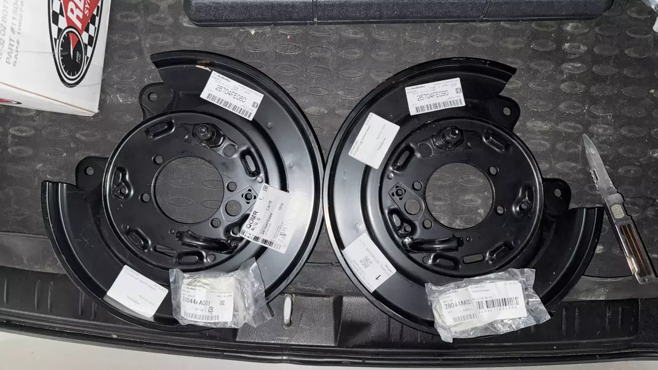 Існує інший, більш фен-шуйний спосіб встановити задні brembo gold на кулаки Forester SG XT - замінити рідні опорні щитки на щитки від Impreza WRX. Щитки від Impreza WRX мають правильну відстань між отворами кріплення супорта, тож ніякі адаптери не потрібні. Єдине що треба заколхозити - обрізати верхній загнутий край щитків (і пофарбувати щоб не ржавіли) для того щоб в WRX щиток помістився 316 гальмівний диск для brembo gold (у WRX розмір диска 290). Також вони мають кріплення під 170мм механізм стояночного гальма, що ідеально співпадає з Forester SG XT.